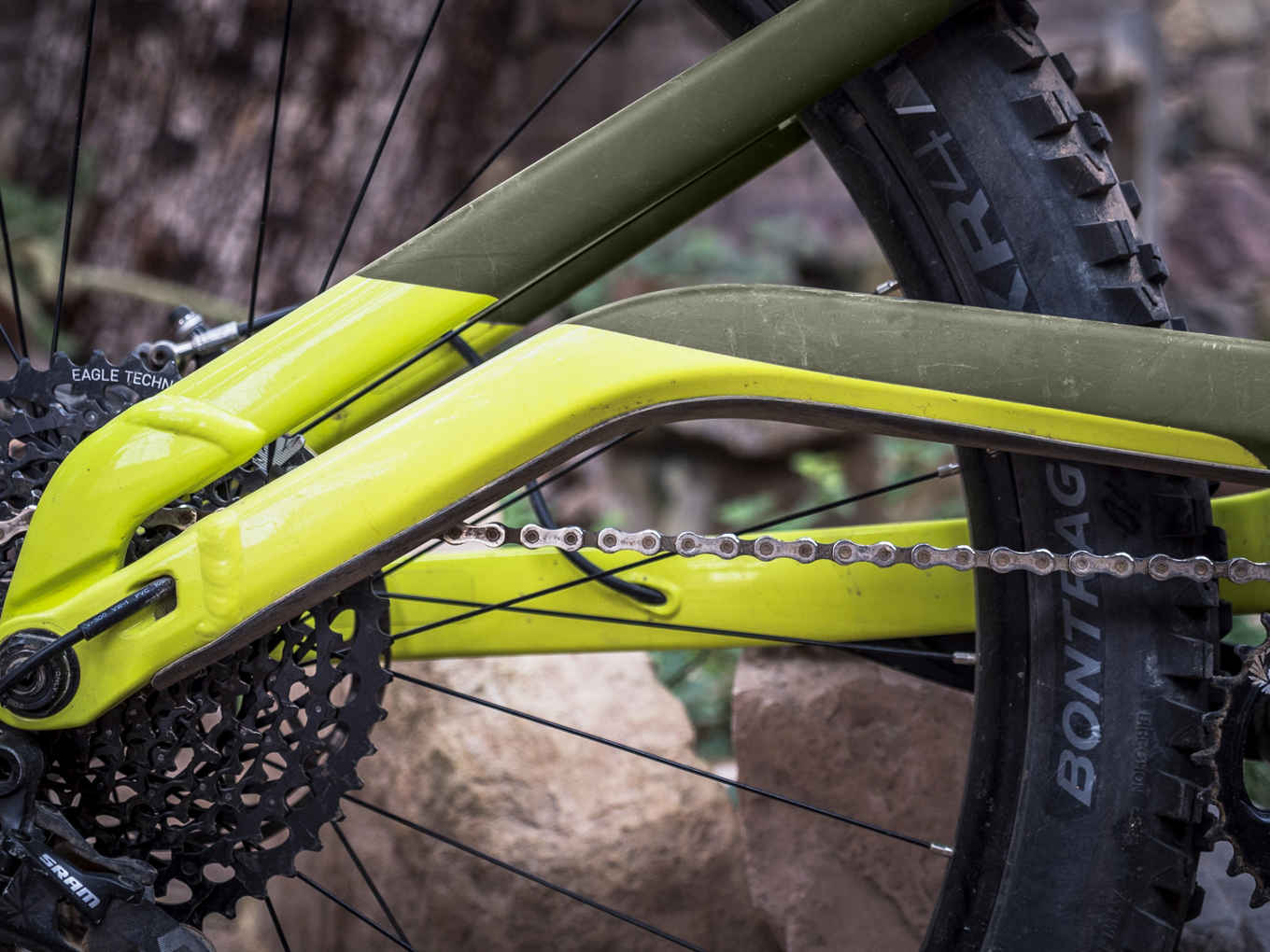 Construit en aluminium, le Trek Full Stache reprend la caractéristique principale de son aîné : une base droite surélevée, qui permet, associée à un point de pivot bien placé, de fabriquer un arrière très court (427mm ou 430mm) sans que la chaîne ne soit un obstacle. Le cadre utilise le standard Boost.