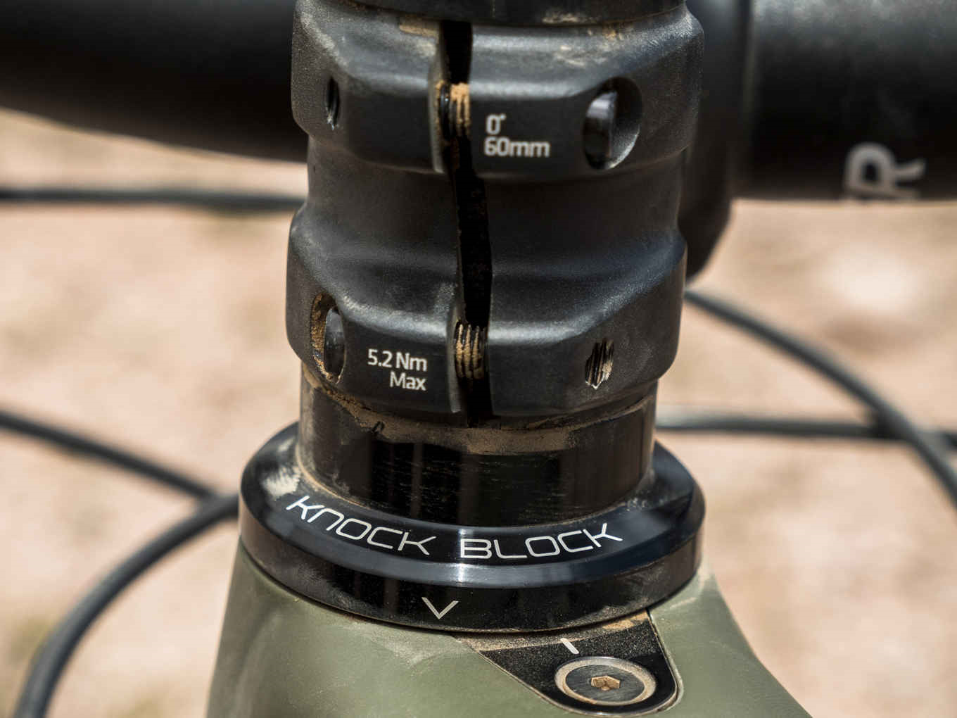 Le dernier né de Trek ne manque pas de détails de fabrication, c’est même un véritable festival ! Il est notamment doté du système Knock Block, qui empêche la fourche de venir taper dans le tube diagonal. Le Knock Block fonctionne grâce à un ensemble potence – entretoise spécifique et d’une butée dans le cadre, et enfin d’un renfort en caoutchouc sur le cadre, « au cas où ». Remarquons par ailleurs une protection de down tube intégrée un peu plus bas, pour faire barrière aux pierres volantes et autres impacts.