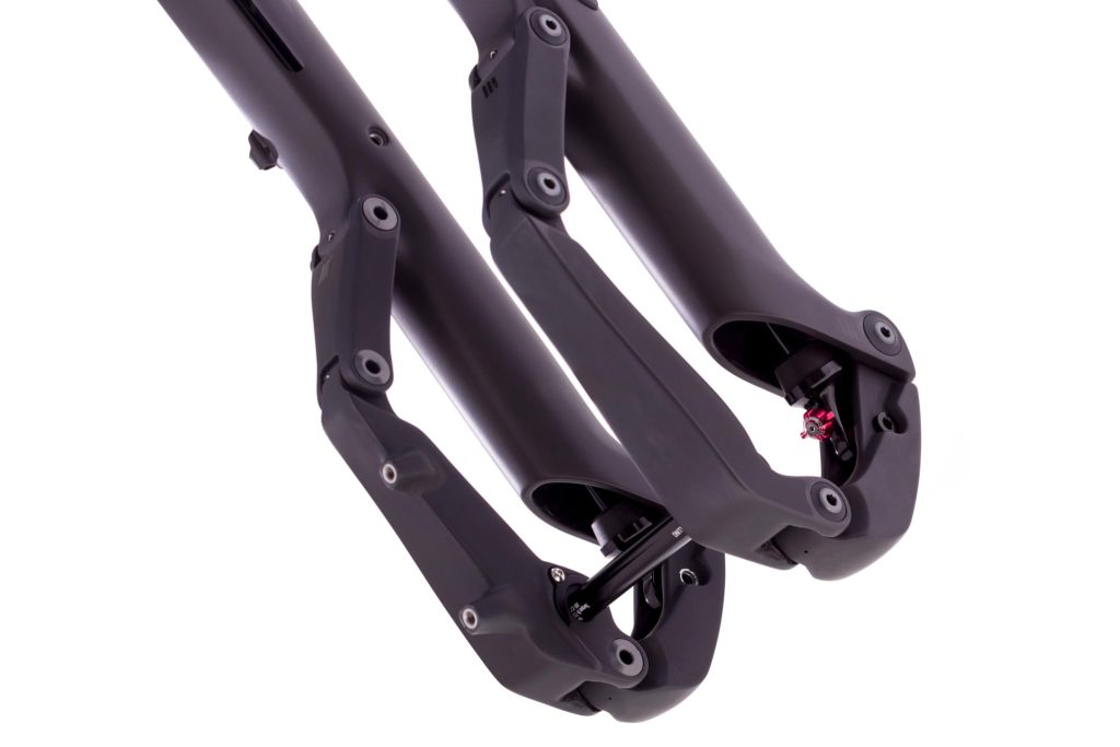 Mais quel est leur concept ? Sur le papier et au niveau esthétique, mais avec un peu (beaucoup) de marketing à la sauce US en plus, il n’est pas sans rappeler celui de la fameuse fourche française Motion, qui a déjà fait couler beaucoup d’encre de ce côté-ci de l’Atlantique. Dans les deux cas, l’idée est en tout cas de proposer quelque chose de différent par rapport aux classiques fourches à suspension avec leurs plongeurs coulissants.