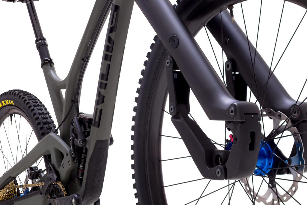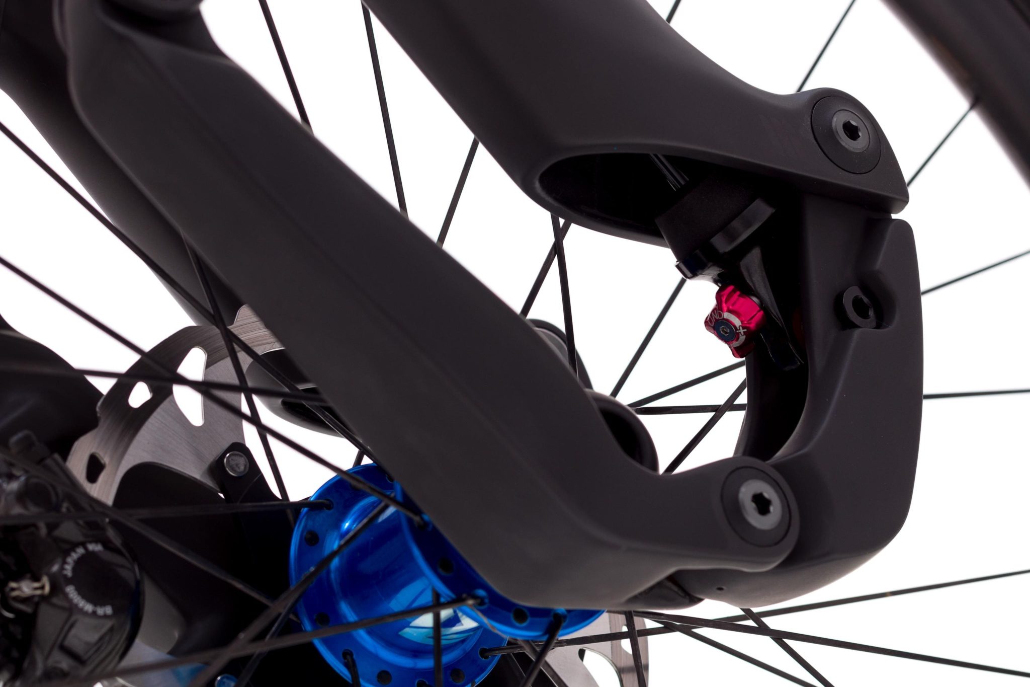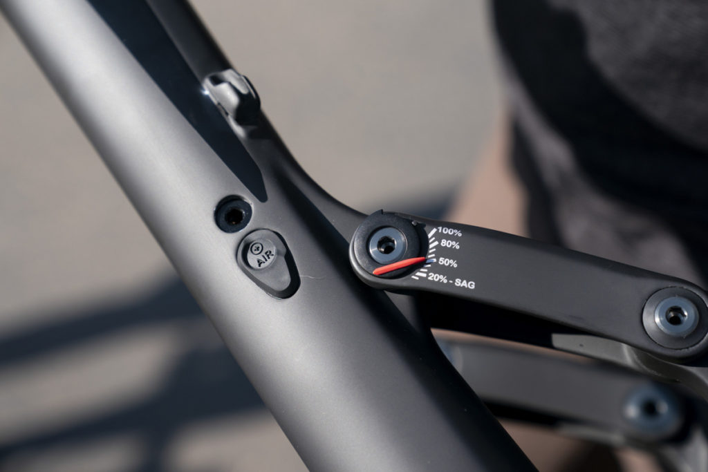 Le châssis de la fourche est entièrement en carbone (avec un ancien de chez Enve dans la boîte, on s’en serait douté) pour un poids annoncé de 1980g. Sur le côté de la fourche, on remarque aussi un petit indicateur de SAG qui montre que pas mal de détails ont été soignés.