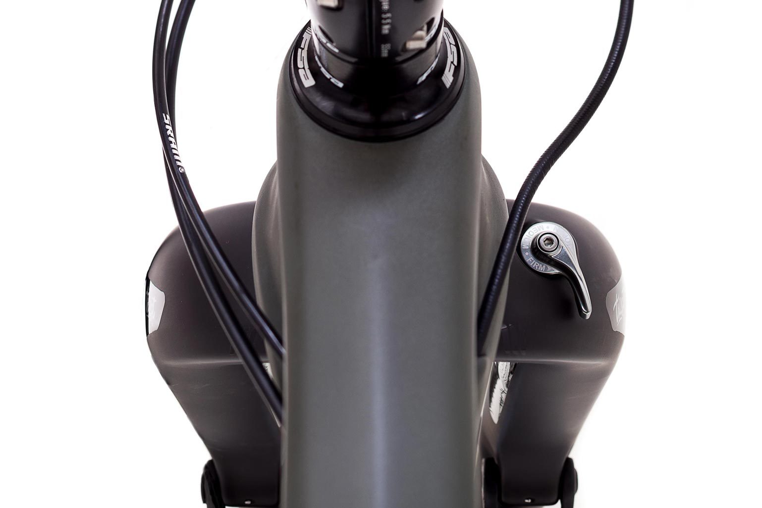 La spécificité de la fourche Trust Message est d’offrir un parallélogramme déformable situé sur la partie basse de la fourche, ce qui n’est pas sans rappeler une autre suspension atypique : la Lauf Islandaise. Mais contrairement à cette dernière qui assure l’amortissement par le biais de lames en carbone déformables (et difficilement contrôlables), on retrouve bien ici une cartouche d’air, ainsi qu’un système hydraulique qui sont cachés dans les fourreaux.