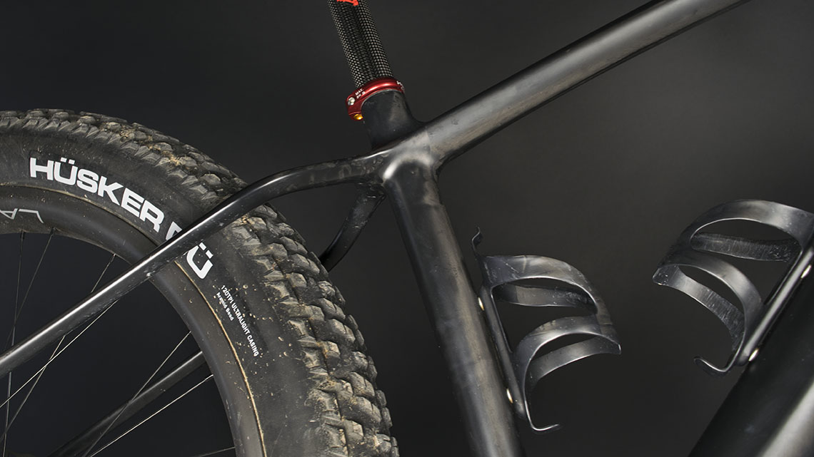 La fourche (550g) et les roues proviennent aussi de chez eux. Elles sont dotées de jantes en carbone à 690g pièce. « Le but étant de rouler dans le désert et d’affronter la rocaille, nous avons fait le choix de la sécurité même si, ici aussi, il existe des options encore plus légères », explique « Madcow », le fondateur du magasin bien connu dans la communauté des « weight-weenies ».