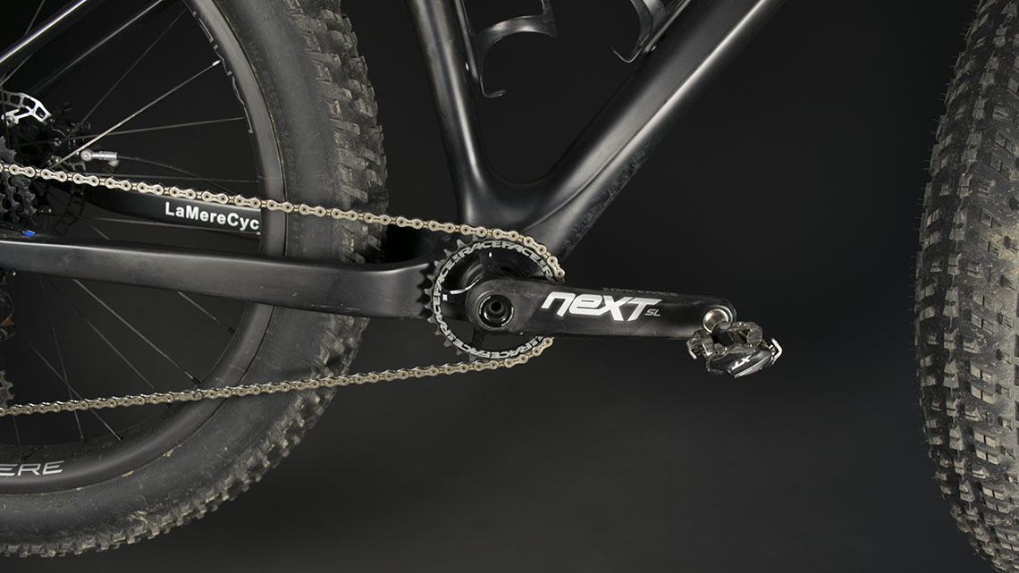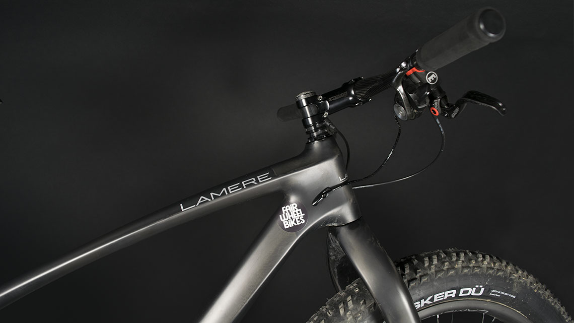 Le cadre qui a servi de base à ce projet est un LaMere carbone; une marque américaine qui revend des cadres et des composants asiatiques sélectionnés par ses soins. Ce n’est pas le plus light, avec 1285g annoncés, mais il permet le montage d’autres composants légers là où d’autres fatbikes imposent des restrictions (roues, pédalier notamment). Ces cercles ont été montés sur des moyeux Tune Fat King et Fat Kong avec des rayons Pillar en titane. Les pneus proviennent de chez le spécialiste du froid 45 North et sont montés en tubeless… ce qui n’est pas une mince affaire, les spécialistes vous le diront ! Pour le reste, Farwheelbikes a eu recours à de grands classiques du light, avec un ensemble cintre/tige de selle des Allemands de Schmolke, une selle des Suisses de Pop-Products, une potence Extralite et quelques produits KCNC comme le serrage de selle et le jeu de direction. La transmission est en Sram XX1 et les freins des Magura MT8. Plus d’infos sur le site de Fairwheelbikes, ainsi que sur leur blog, très bien fait et qui détaille un grand nombre de leurs montages. C’est surtout axé route, mais c’est tout de même un régal pour les yeux ! Photo : Fairwheelbikes