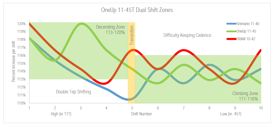 Pour promouvoir ses grands pignons de 40 et 42 dents pour cassettes 10 vitesses, OneUp met en avant que sa solution permet d’avoir « 90% des bénéfices du 1×11 pour seulement 10% du prix ». Ici, l’argumentaire est différent : le pignon de 45 dents permet d’avoir une étendue de développements nettement plus grande (+12,5%). Cela permet par exemple de passer d’un plateau de 30 à un 34 dents à l’avant, sans rien perdre en développement mini pour les côtes.