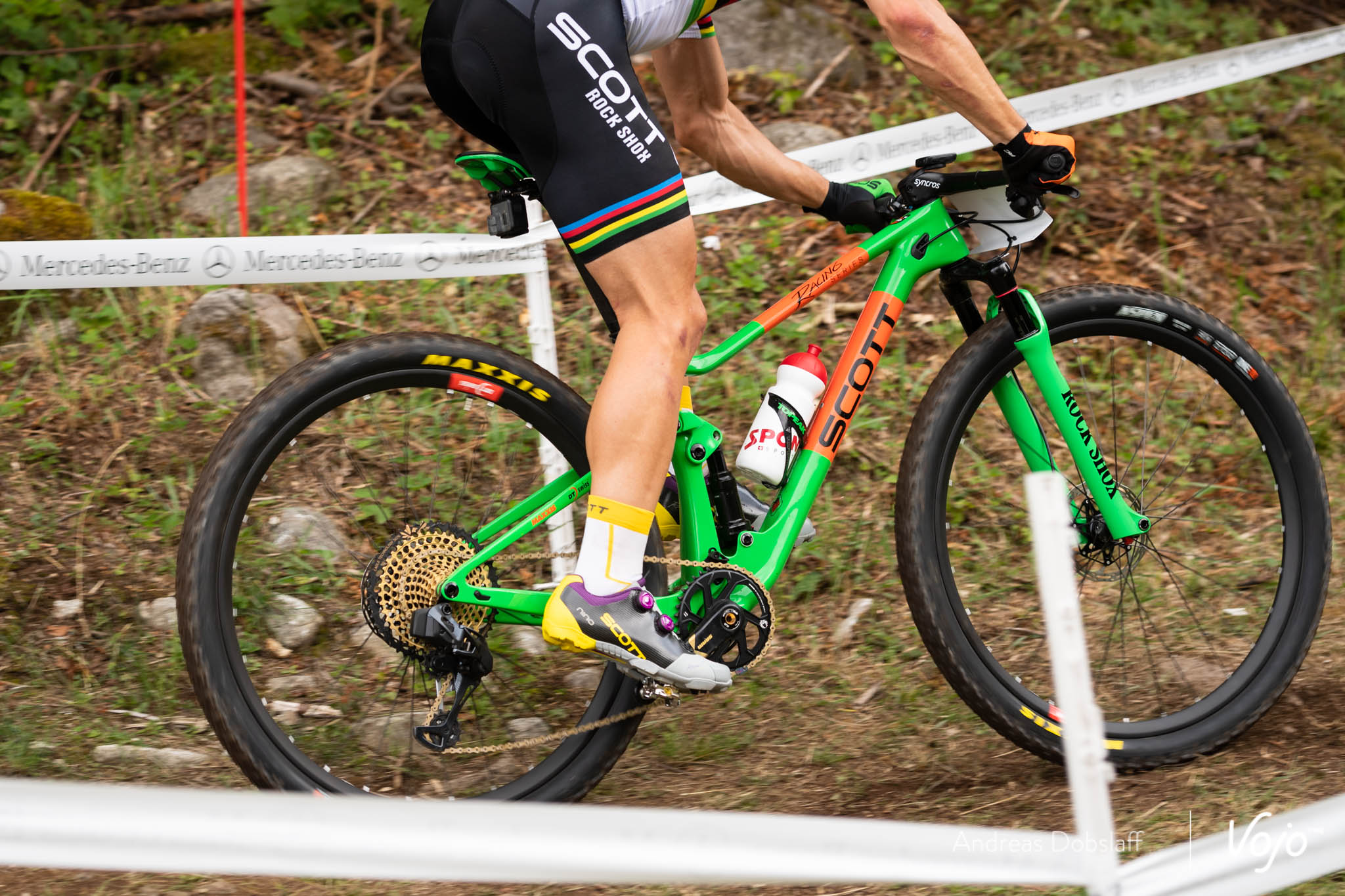 Même ses autres sponsors se sont mis au diapason et tous ont repris leurs anciens logos : RockShox, Sram (au niveau du logo sur le cadre, mais pas sur sa transmission Eagle électronique, toujours en test), Syncros, DT-Swiss,…