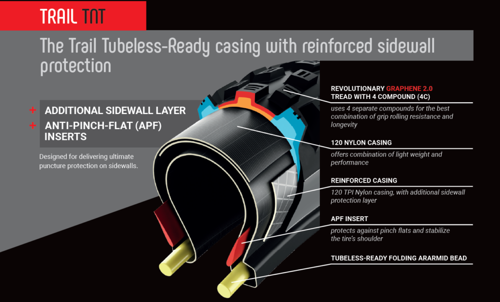 Deux carcasses, Trail ou Enduro, sont au programme. La carcasse Enduro est une double carcasse (2-ply, deux épaisseurs de nylon au lieu d’une) en nylon 120 tpi doublée d’un renfort au niveau des tringles pour éviter les pincements, tandis que la carcasse Trail, plus légère, dispose d’une construction classique simple épaisseur en nylon 120 tpi mais y ajoute un renfort en tissu sur les flancs. Côté gomme, on retrouve évidemment le mélange 4C dopé au graphène propre à la marque.