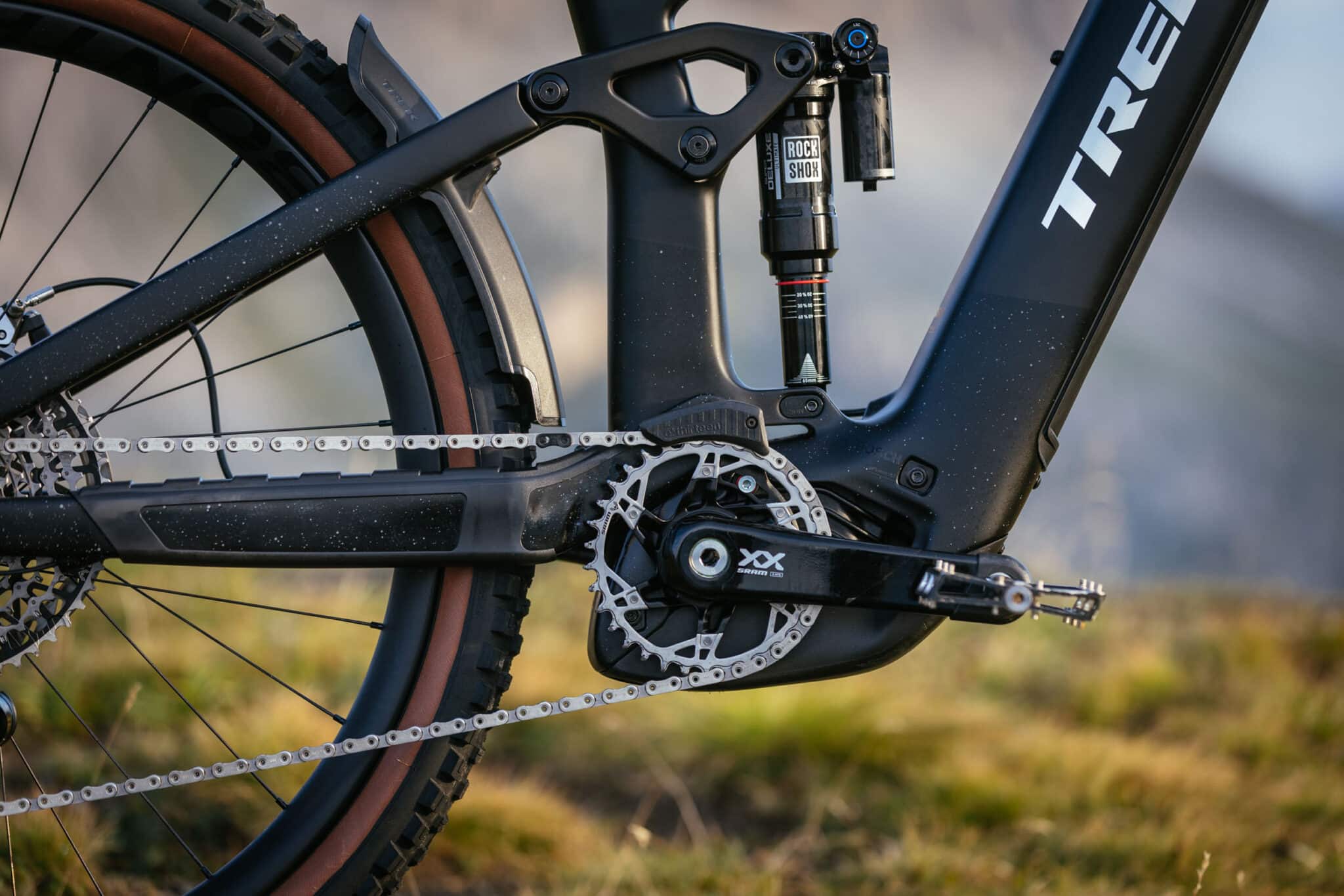 Il est équipé de la batterie de 800 Wh, ce qui devrait permettre de gagner un peu d’autonomie par rapport à la version précédente en 750 Wh. Si elle est toujours amovible par la face inférieure du tube diagonal, son système de maintien a été revu et Trek indique avoir ajouté une vis de tension supplémentaire qui doit permettre de mieux tenir la batterie pour les usages les plus engagés.