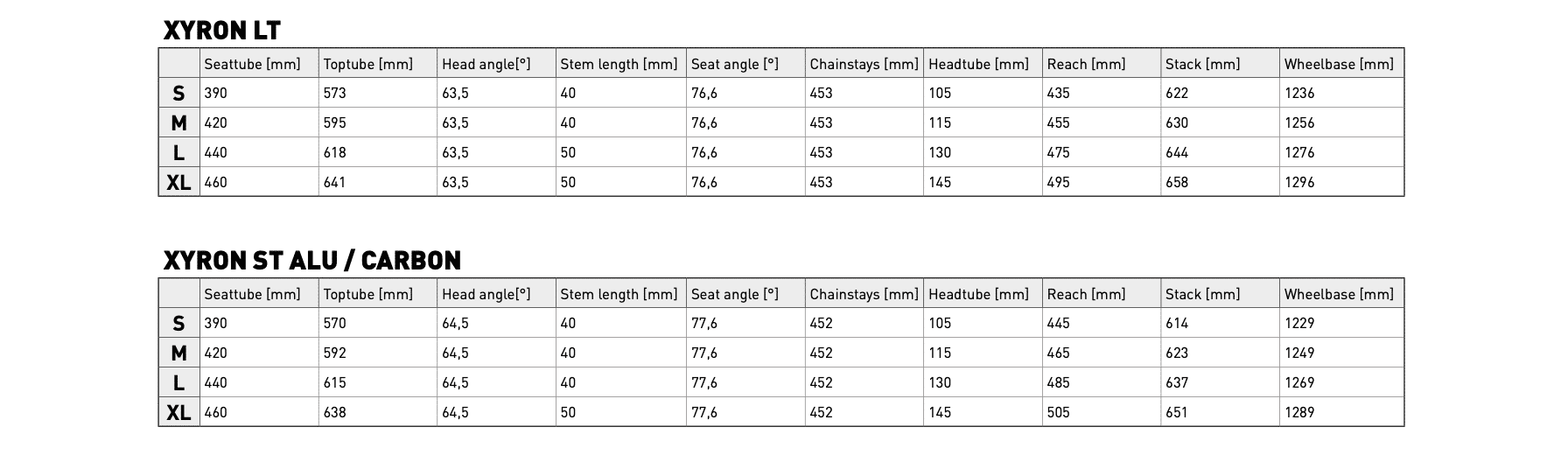 Tous deux en 29″, le Xyron LT est en 160/170 mm de débattement avec un cadre uniquement en carbone tandis que le Xyron ST est en 150/150 mm et cadre carbone ou aluminium. Côté géométrie, les deux modèles sont bien placés dans leur segment avec un angle de direction de 6″,5° (LT) ou 64,5° (ST), un reach de 455 mm (LT) ou 465 mm (ST) et des bases de 452 ou 453 mm. On surveillera toutefois l’angle de tube de selle, qui affiche un bon 77,6° sur le ST mais est un peu plus couché sur le LT (76,6°).