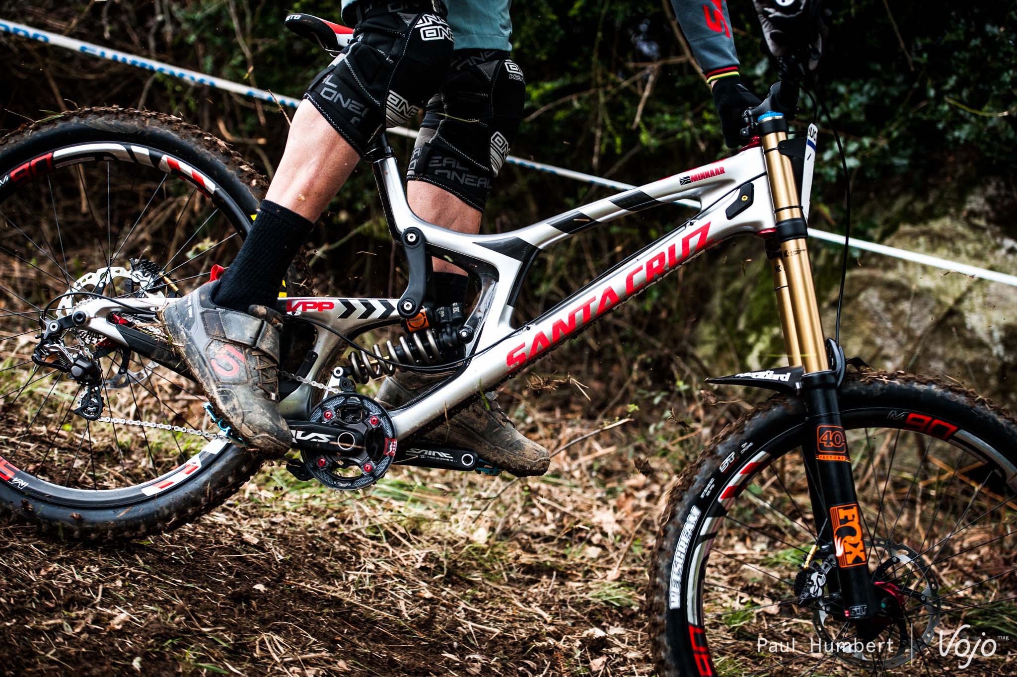 Greg Minnaar est au guidon d’un Santa Cruz V10 à la déco du plus bel effet.