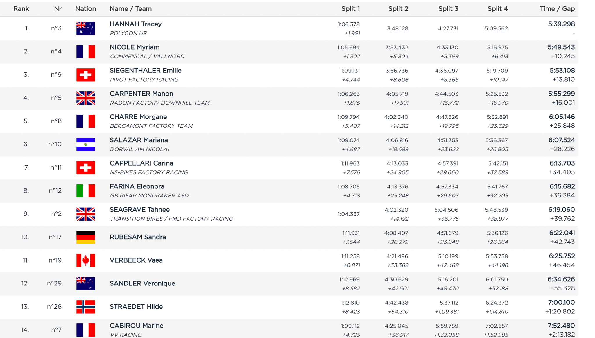 Blessée à l’épaule pendant les entraînements du dimanche matin, Rachel Atherton est contrainte à l’abandon pour la première fois depuis plusieurs saisons. C’est Tracey Hannah qui tire profit de cette absence. Elle boucle son run en 5 minutes 39 et met Myriam Nicole à bonne distance. La Française est à 10 secondes mais prend la médaille d’argent.