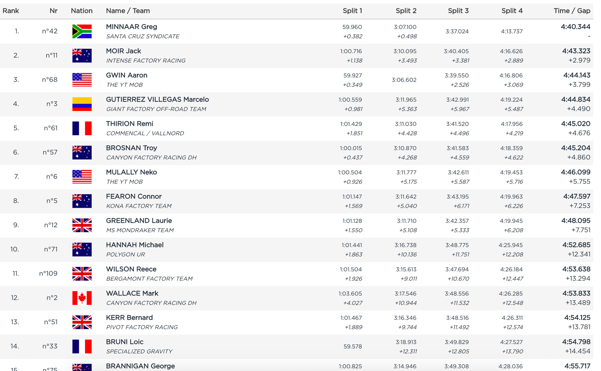 La série de victoire de Rachel Atherton a été interrompue après plusieurs dizaines de victoires consécutives sans jamais être dérangée. C’est Tracey Hannah qui bénéficie de la blessure de la britannique pendant les entraînements. Elle remporte la course et deux françaises grimpent sur le podium. Chez les hommes c’est Greg Minnaar qui fait régner sa loi. Il signe la première victoire d’un 29 pouces sur une coupe du Monde de descente.