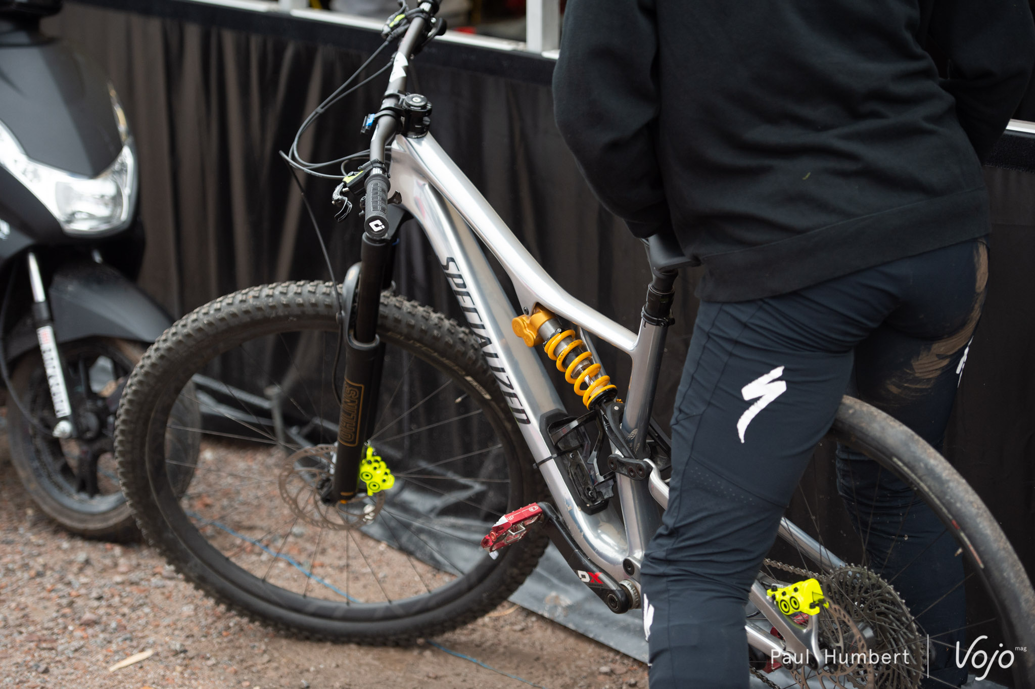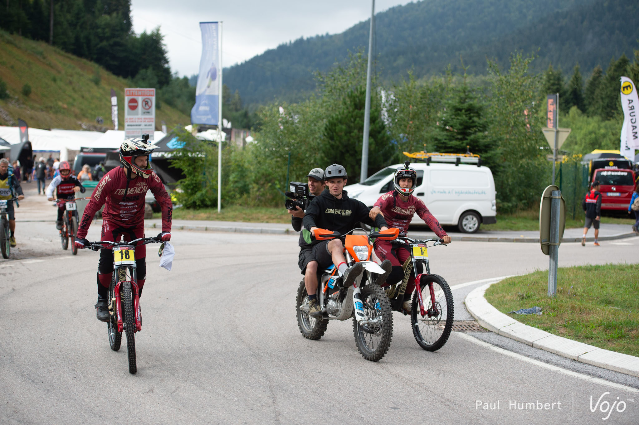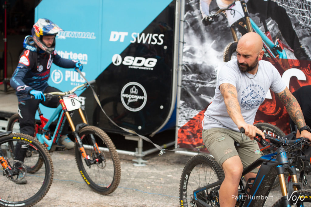 À La Bresse, les paddocks sont situés en contrebas de la remontée mécanique et les top pilotes sont tractés par leurs mécanos jusqu’au sommet. Les techniques varient d’un team à l’autre. Moto électrique chez Commencal, vélo électrique pour Mondraker ou Specialized.