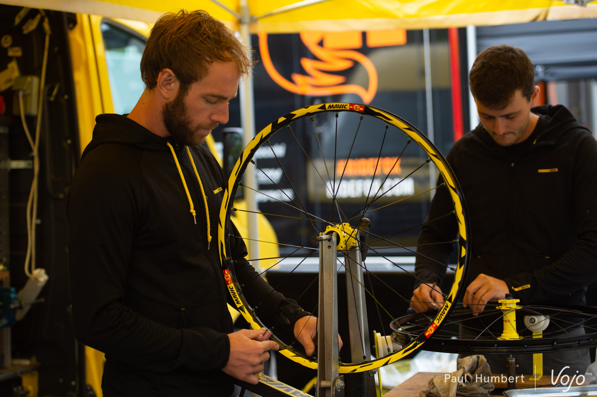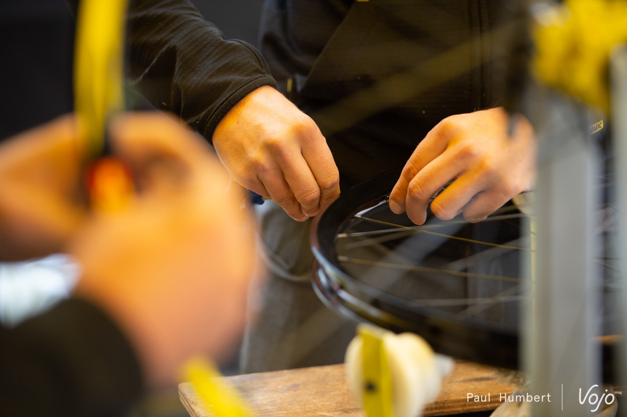 Les roues de course des pilotes passent entre les mains habilles des techniciens Mavic. À droite sur la photo, on retrouve Alexis que vous avez peut-être aperçu à la télévision cet été pendant qu’il survolait le Tour de France à VTT.