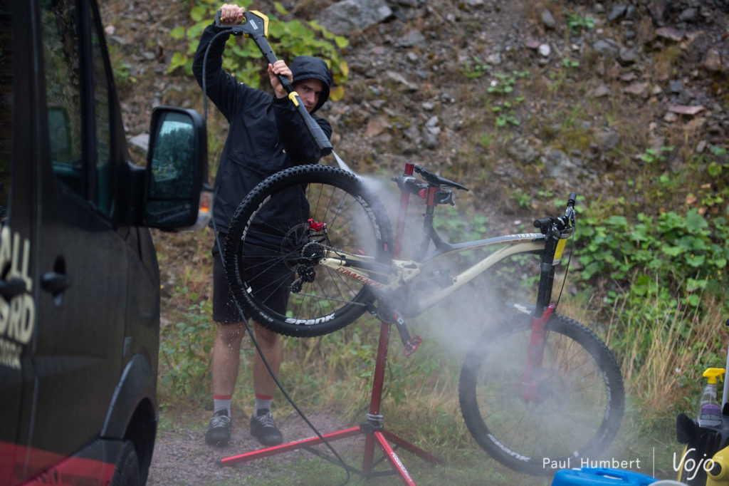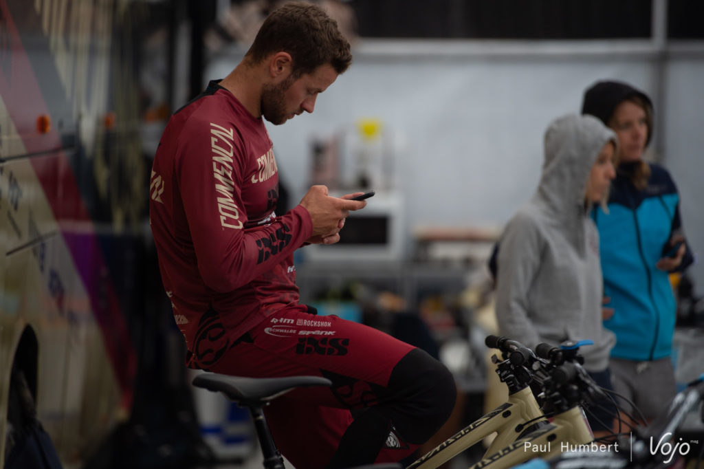 Chez Commencal, Amaury Pierron et Rémy Thirion terminent leurs reconnaissances. Les vélos sont lavés, préparés pour les qualifications et les pilotes récupèrent.