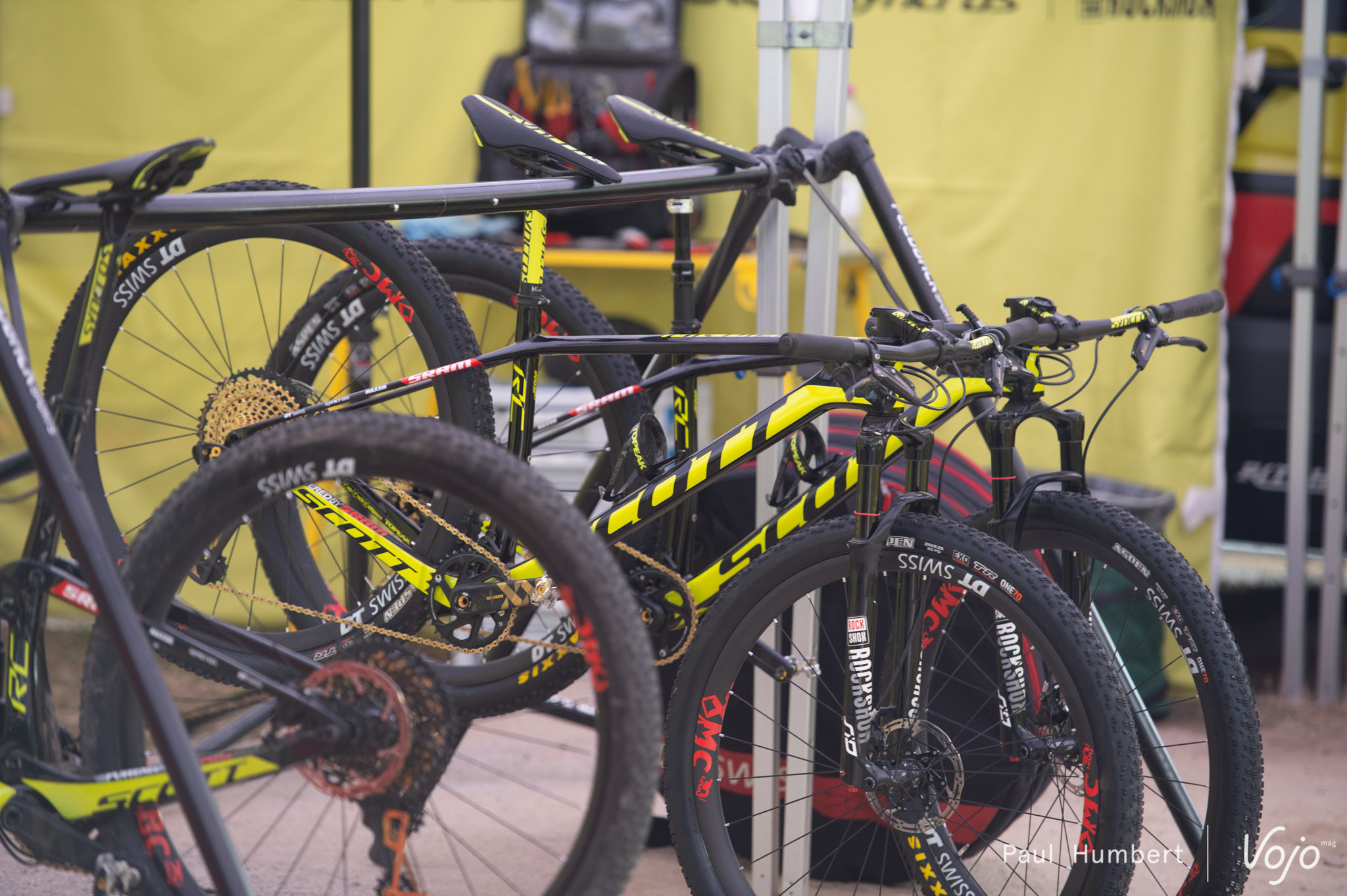 Les paddocks de la dernière manche de la coupe du Monde de la saison se sont plantés à La Bresse, dans les Vosges. Les stands des équipes de descente et de cross-country sont mélangés et on y déambule en ce vendredi matin. Au programme de la journée, les qualifications de la descente et l’épreuve de Short Track en cross-country. Peu de grosses nouveautés sont affichées dans les stands qui se ferment petit à petit pour s’isoler des averses régulières. Ambiance :