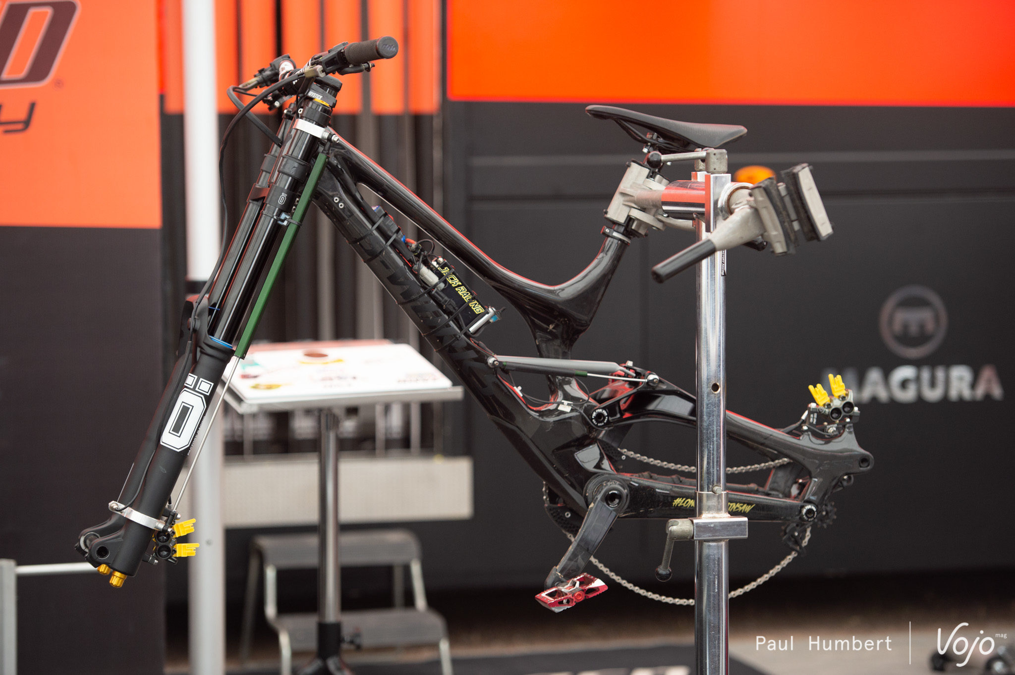 Sous la même tente, le vélo d’acquisition de données de Loïc Bruni est prêt à délivrer une longue liste d’informations qui permettront au champion du Monde en titre d’affiner ses réglages.