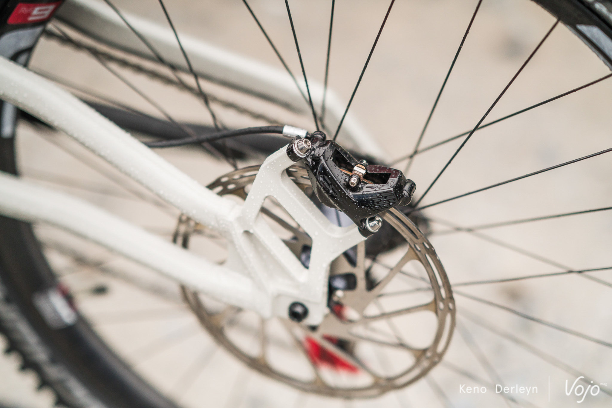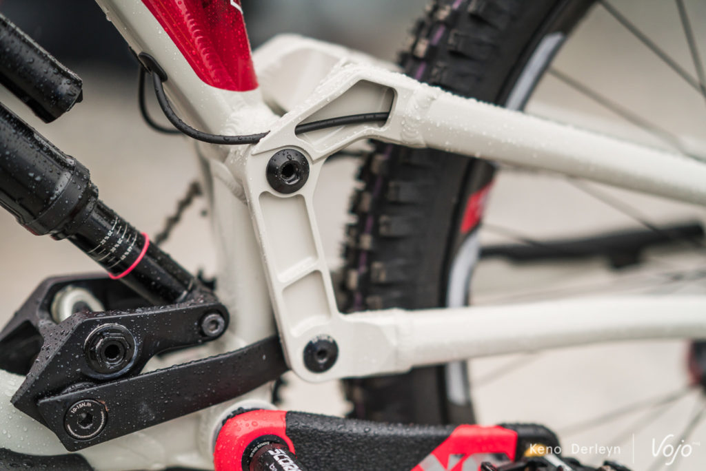 La roulette semble également réglable. On imagine qu’un ajustement de la cinématique est possible, en changeant le point d’ancrage de l’amortisseur sur le cadre. Le travail de la suspension évoluera certainement vers plus de dynamisme, ou plus de linéarité. La position de la roulette de renvoi s’adaptera très certainement à ces différentes positions. Pour rappel, cette roulette est présente pour libérer la suspension des différents effets de chaîne pouvant altérer son fonctionnement.
