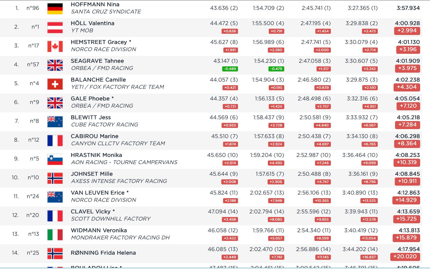 Touchée lors de la manche autrichienne à Leogang, Nina Hoffmann n’avait plus levé les bras depuis 2023. C’est désormais chose faite, au terme d’un run à la fois solide et fluide, bouclé en 3:57.9 — la seule femme du week-end sous la barre des 4 minutes.