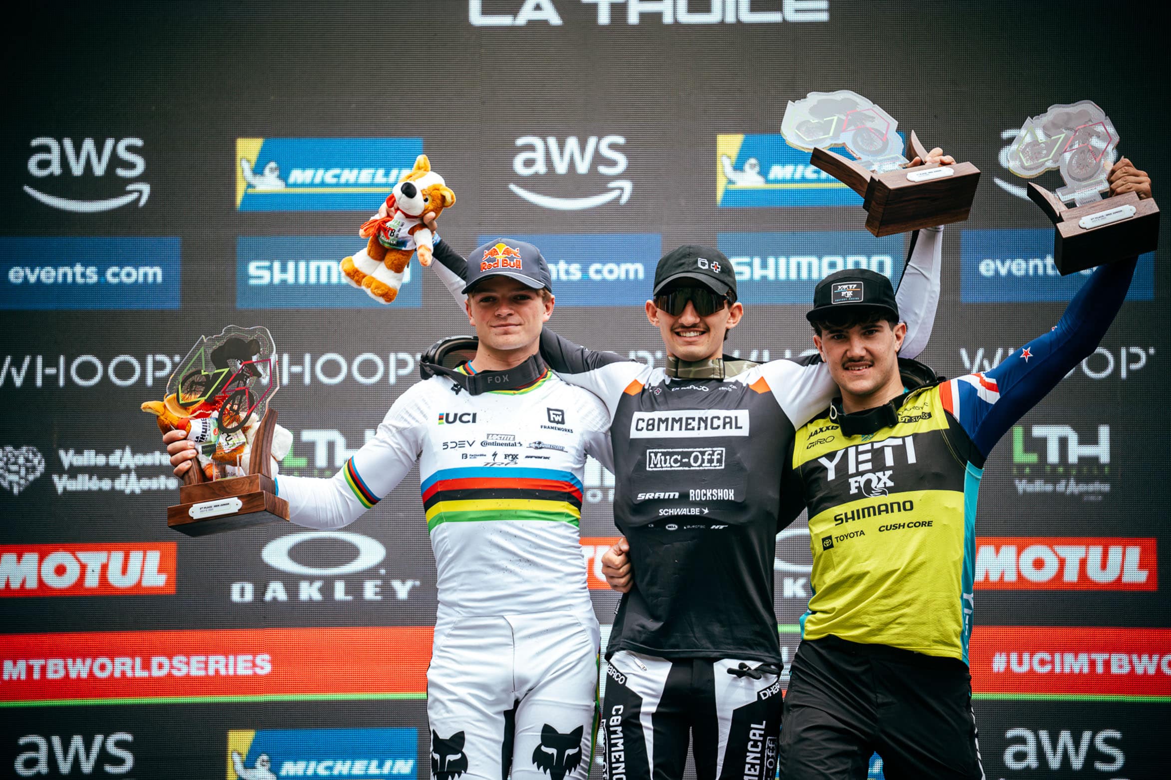 Une nouvelle station alpine au calendrier, une piste à la pente vertigineuse, des conditions changeantes et des écarts infimes… La manche de coupe du monde de DH de La Thuile n’a pas manqué de rebondissements. Et au terme d’un week-end haletant, ce sont Jackson Goldstone et Nina Hoffmann qui repartent avec les plus belles médailles autour du cou. Une journée parfaite pour le Santa Cruz Syndicate, tandis que les jeunes Till Alran et Aletha Ostgaard s’offrent leurs propres moments de gloire dans les catégories juniors.
