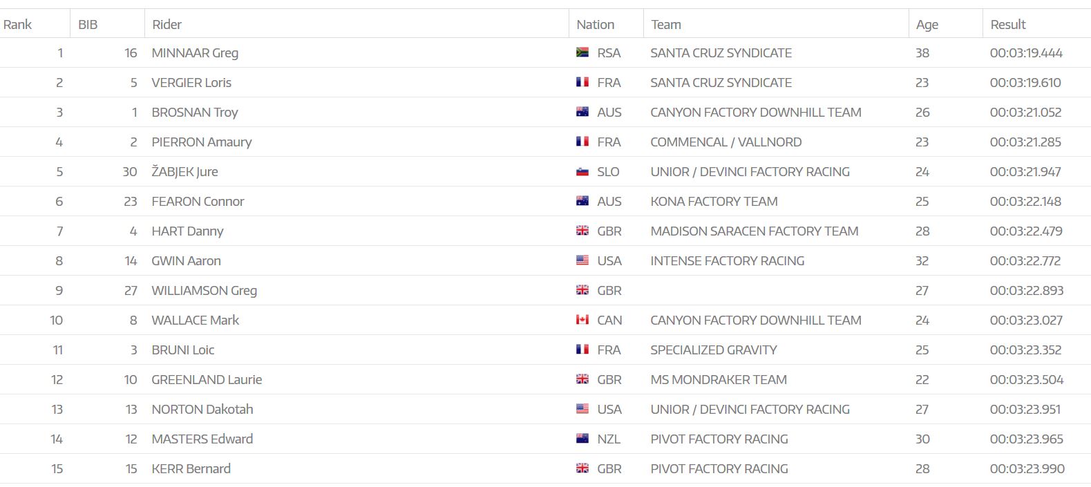 Greg Minnaar is back ! Après une saison blanche l’année dernière suite à sa blessure au bras, le Sud-Africain remporte ces qualifications d’un cheveu devant son coéquipier du Santa Cruz Syndicate, Loris Vergier (+0,16 s). C’est l’Australien Troy Brosnan, actuel leader de la coupe du monde, qui prend la troisième place, suivi de près par Amaury Pierron.
