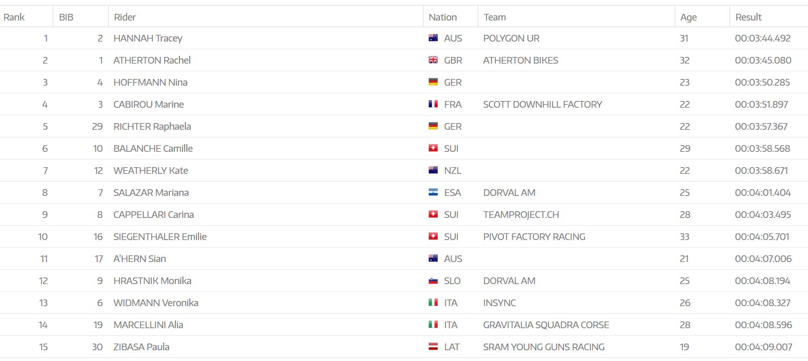 Chez les dames, en l’absence de Myriam Nicole et Tahnée Seagrave, blessées, il semblerait qu’on se dirige vers une bataille entre Tracey Hannah et Rachel Atherton. L’Australienne devance l’Anglaise de 0,58 s, et les autres concurrentes sont reléguées à plus de 5 s. Nina Hoffman est 3e, suivie de Marine Cabirou (seule Française à se qualifier) et Raphaela Richter.
