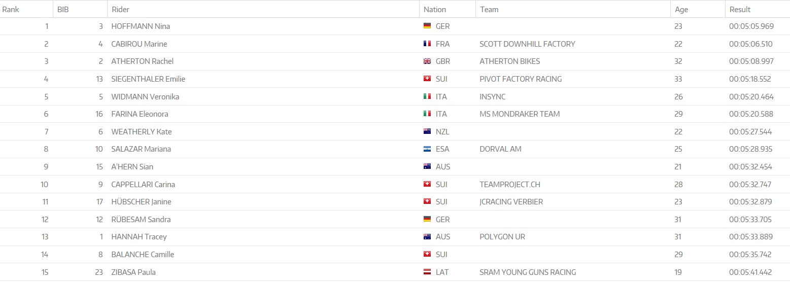 Rachel Atherton est la 3ème pilote du jour, devant Emilie Siegenthaler et Veronika Widmann (Italie). Tahnée Seagrave n’est pas encore de retour, après sa blessure à Fort William.