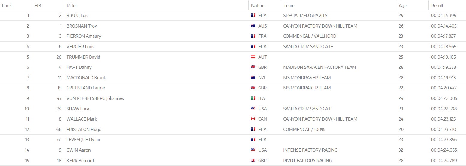 Amaury Pierron est 3ème du jour sur les terres de son team Commencal, à plus de 3 secondes. Il est suivi par Loris Vergier puis l’Australien David Trummer. Danny Hart est 6ème, Aaron Gwin 14ème. On retrouve encore plus loin Greg Minnaar (20ème). Les Français Hugo Frixtalon et Dylan Levesque se classent 12ème et 13ème, tandis que Thomas Estaque est 17ème et Florent Payet 21ème.