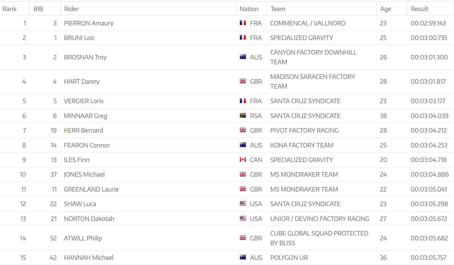 Un seul pilote a réussi a descendre sous les 3 minutes sur la piste du Mont Chéry, c’est Amaury Pierron ! Avec un temps de 2:59.143, il devance Loïc Bruni de près d’1,6 s.
