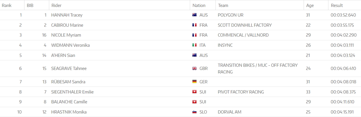 Chez les dames, c’est Tracey Hannah qui s’en sort le mieux pour l’instant. Elle devance Marine Cabirou et Myriam Nicole. Cette dernière a décroché le maillot de championne du monde il y a quelques jours, après son retour de blessure tonitruant au Canada !
