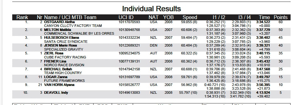 Le public américain a eu droit à sa victoire à domicile grâce à Aletha Ostgaard (Canyon CLLCTV). La jeune pilote de 17 ans s’impose avec autorité, trois secondes devant sa compatriote Matilda Melton (Commencal Schwalbe by Les Orres).