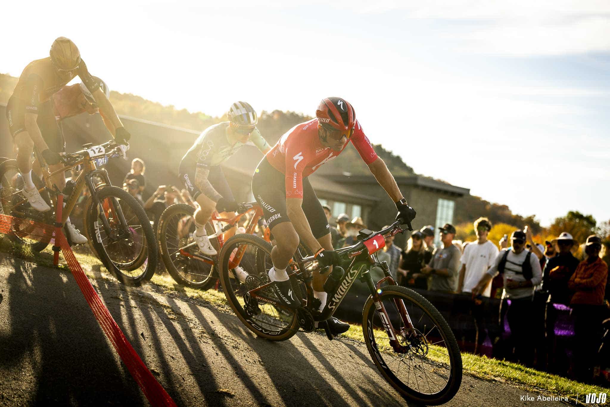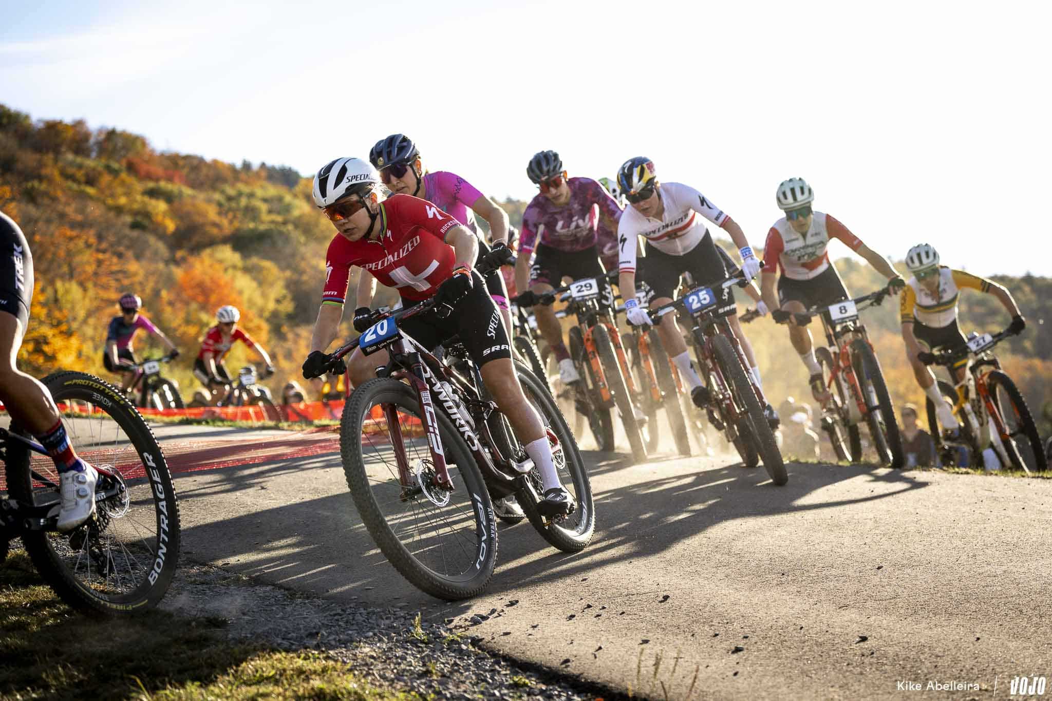 Du bleu-blanc-rouge en ce départ de la course Hommes, avec Luca Martin et Mathis Azzaro aux avant-postes. On notera également le très bon départ d’un autre Français : Adrien Boichis, champion du monde de la discipline en catégorie U23, et bien placé dans la roue de Victor Koretzky !
