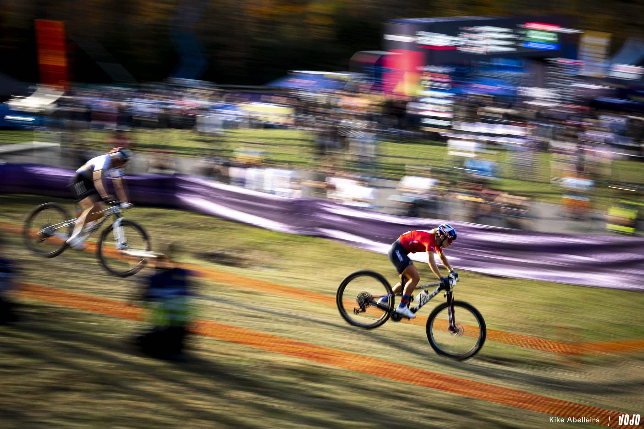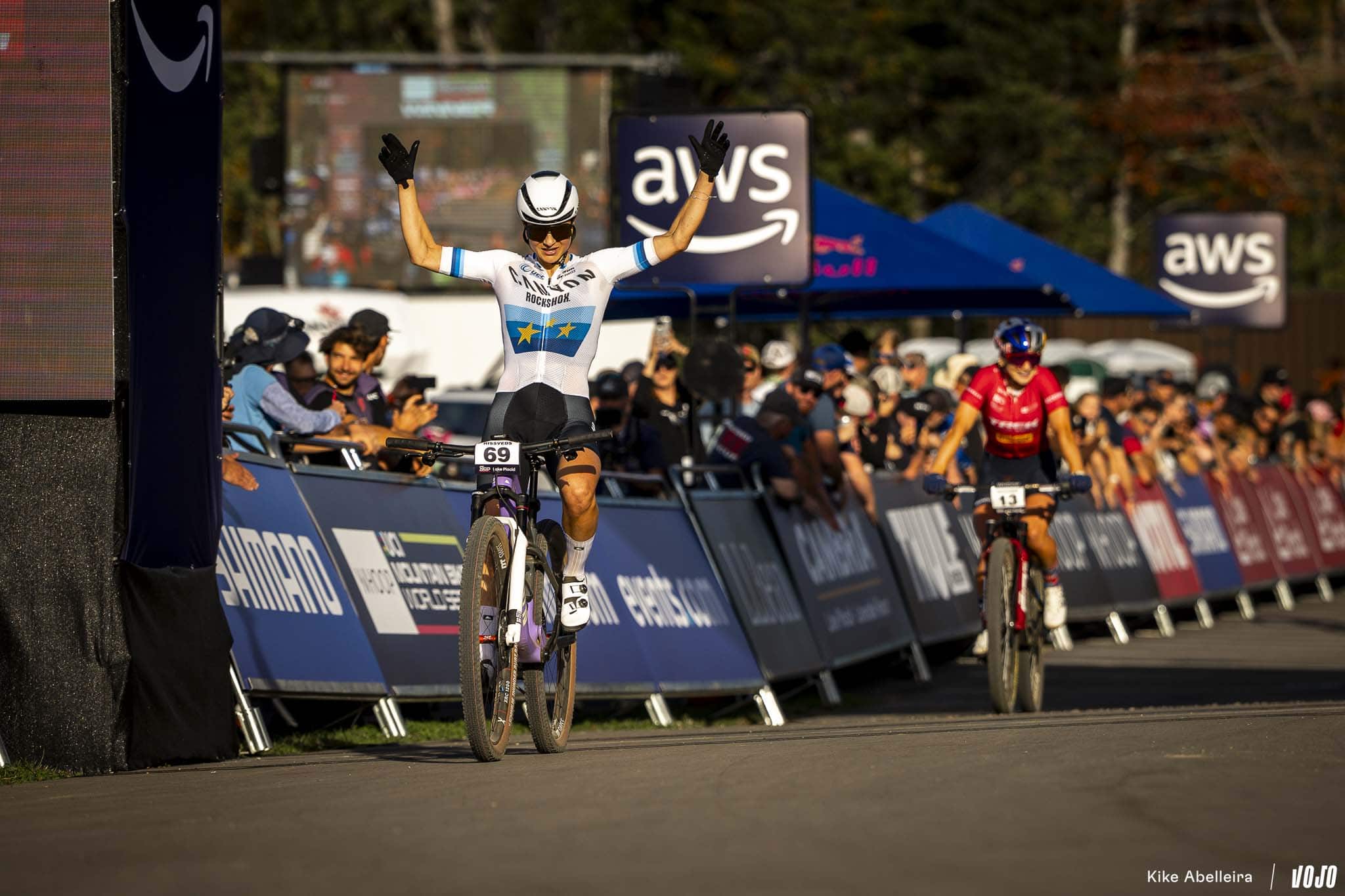 Le peloton est très compact sur ce XCC, un scénario de course assez habituel pour ces épreuves qui durent environ 20 minutes et où les athlètes attendent généralement les derniers tours pour lancer une attaque. Stratégie de course avant tout ! À l’avant de ce groupe de pilotes, c’est Jenny Rissveds, Evie Richards et Alessandra Keller (vêtue de son joli nouveau maillot de championne du monde) qui contrôlent la course.