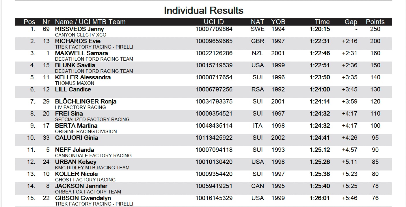 Derrière, le top 10 est complété par Candice Lill (6e), Ronja Blochlinger (7e), Sina Frei (8e), Martina Berta (9e) et Ginia Caluori (10e).