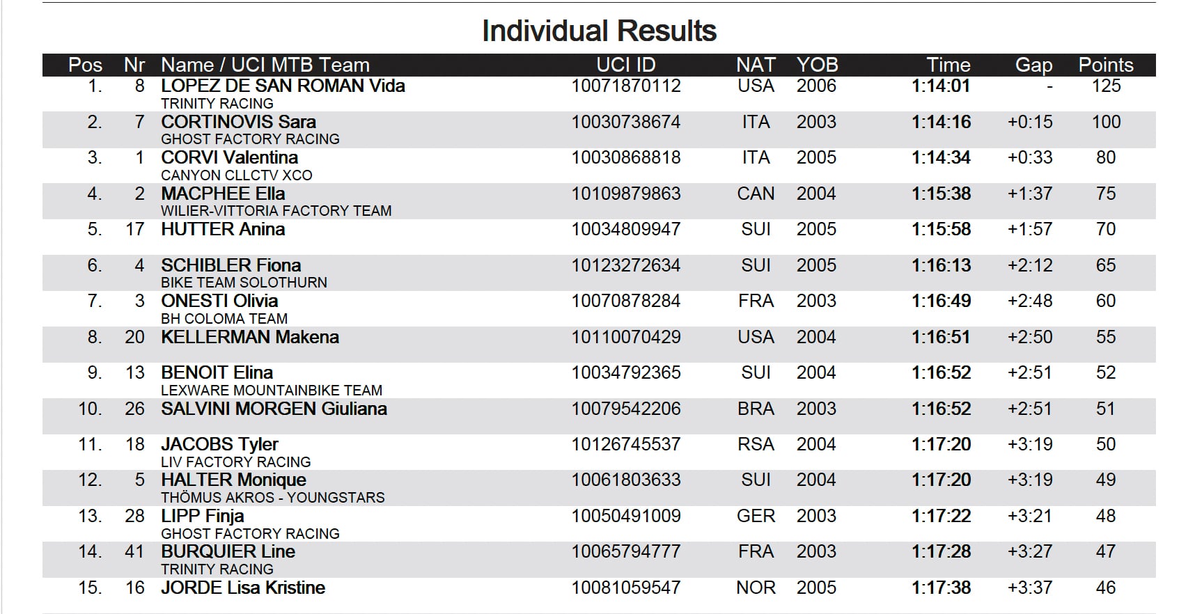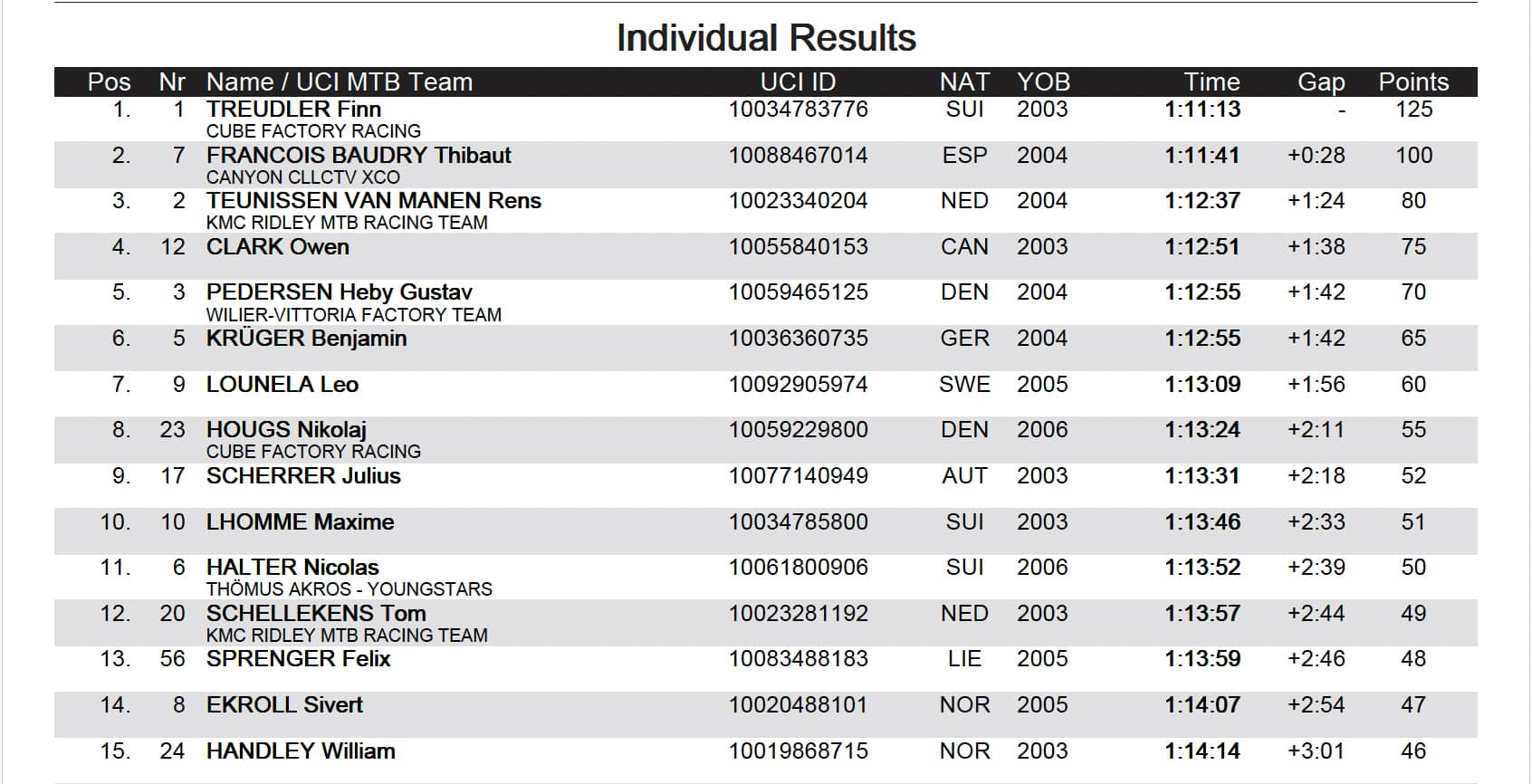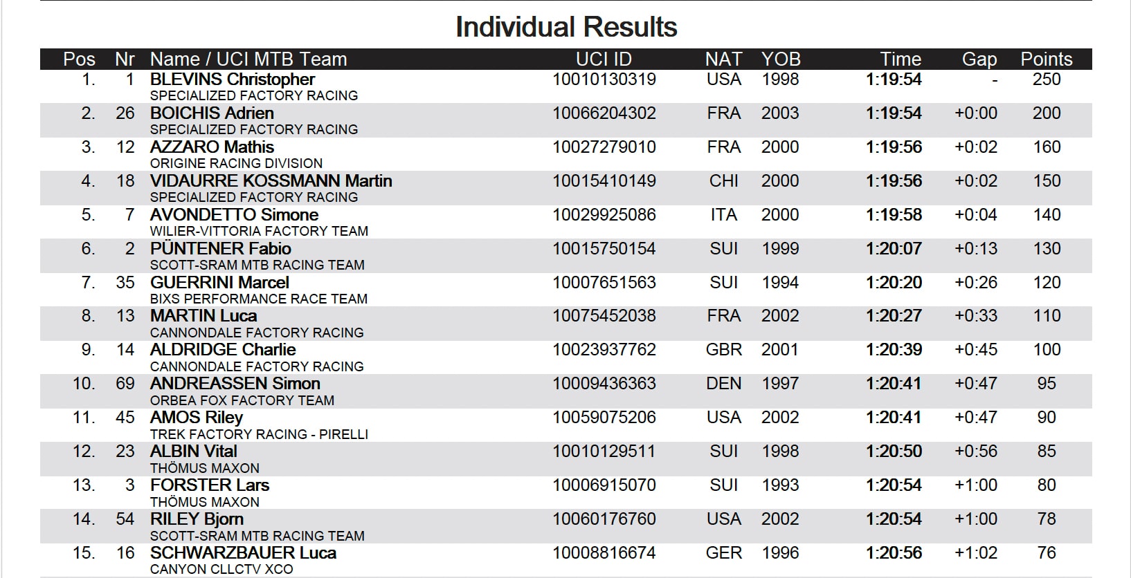 Le top 10 est complété par Fabio Puntener (6e), Marcel Guerini (7e), Luca Martin (8e), Charlie Aldridge (9e) et Simon Andreassen (10e).