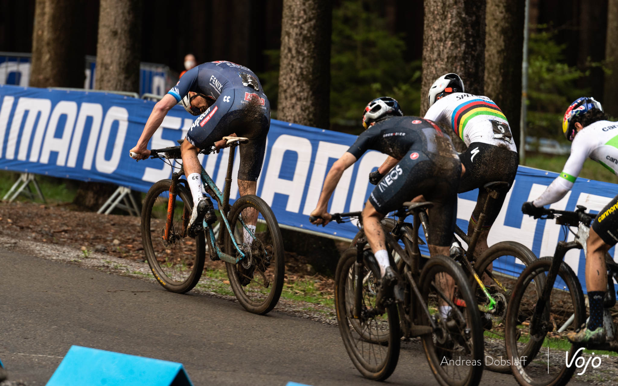 La course commence à se décanter dans le cinquième et avant-dernier tour, lorsque Mathieu van der Poel accélère (quelle surprise) avant la descente. Dans l’immédiat, seul Tom Pidcock est en mesure de sauter dans sa roue mais bien vite, Jordan Sarrou, Victor Koretzky et le jeune allemand Maximilian Brandl, déjà en vue au même endroit l’année dernière (9e du XCO pour sa première année Elite), parviennent à rentrer.