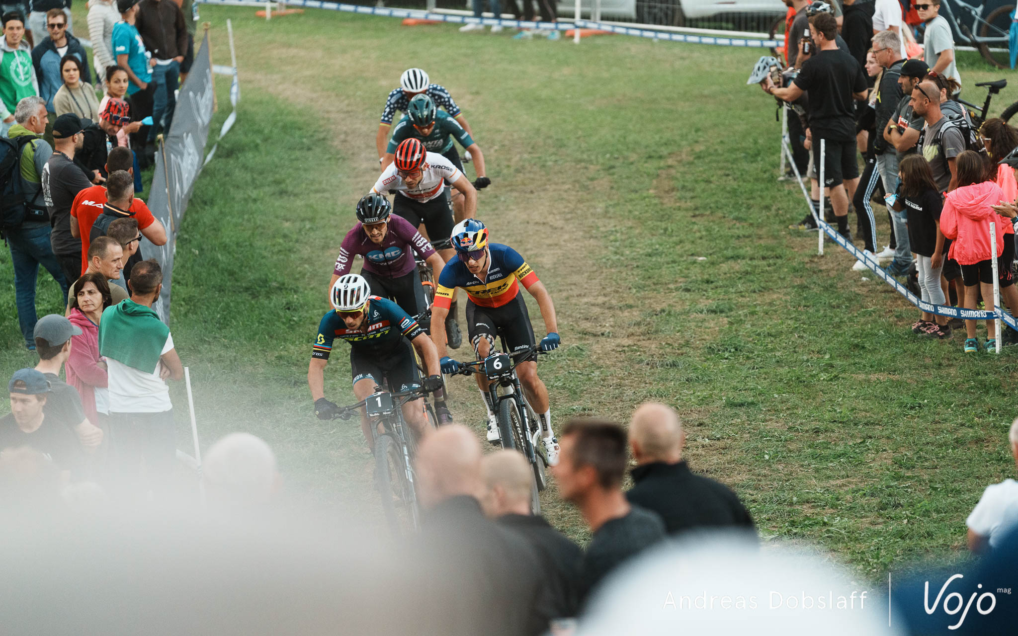 Dès le départ, le Sud-Africain imprime une allure très élevée. Menacé par Filippo Colombo au classement général, il fait passer un message clair : il ne rendra pas son maillot de leader sans se battre ! Juste derrière, Titouan Carod est à l’affût puis suivent Vlad Dascalu, Nino Schurter, Filippo Colombo ou encore Luca Braidot. Enfin, suivent… Plus pour longtemps.