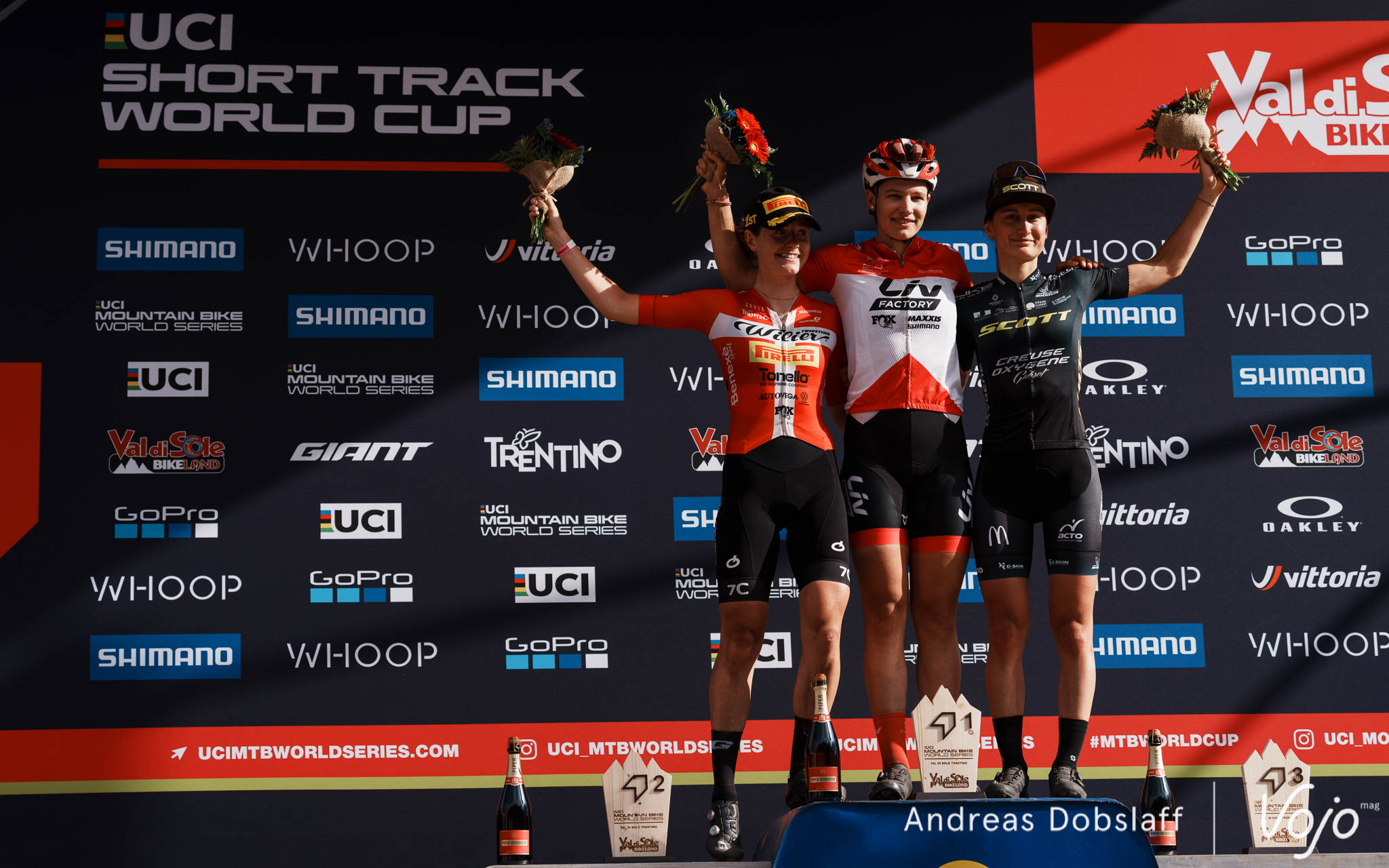Juste derrière, la Française Noémie Garnier continue sa progression et vient signer son tout premier podium de la saison en XCC, malgré un départ compliqué. Nous avons pu recueillir sa réaction à l’arrivée : « J’étais en première ligne et j’ai réussi le meilleur départ, mais ensuite j’ai été un peu enfermée car il y a eu un cafouillage dans la montée du Four Cross. J’ai réussi à passer sur le vélo, mais j’ai été un peu ralentie et je me suis retrouvée en poursuite. On était un petit groupe pour la 3e place toute la course. J’ai été un peu dans le dur à la mi-course mais sur la fin je me suis sentie mieux et mentalement j’étais super bien. Je me suis dit que je n’avais rien à perdre, j’ai fait un super dernier tour pour aller chercher le podium. J’adore Val di Sole, j’ai fait 3e l’an dernier, j’espère rééditer la même performance ! »