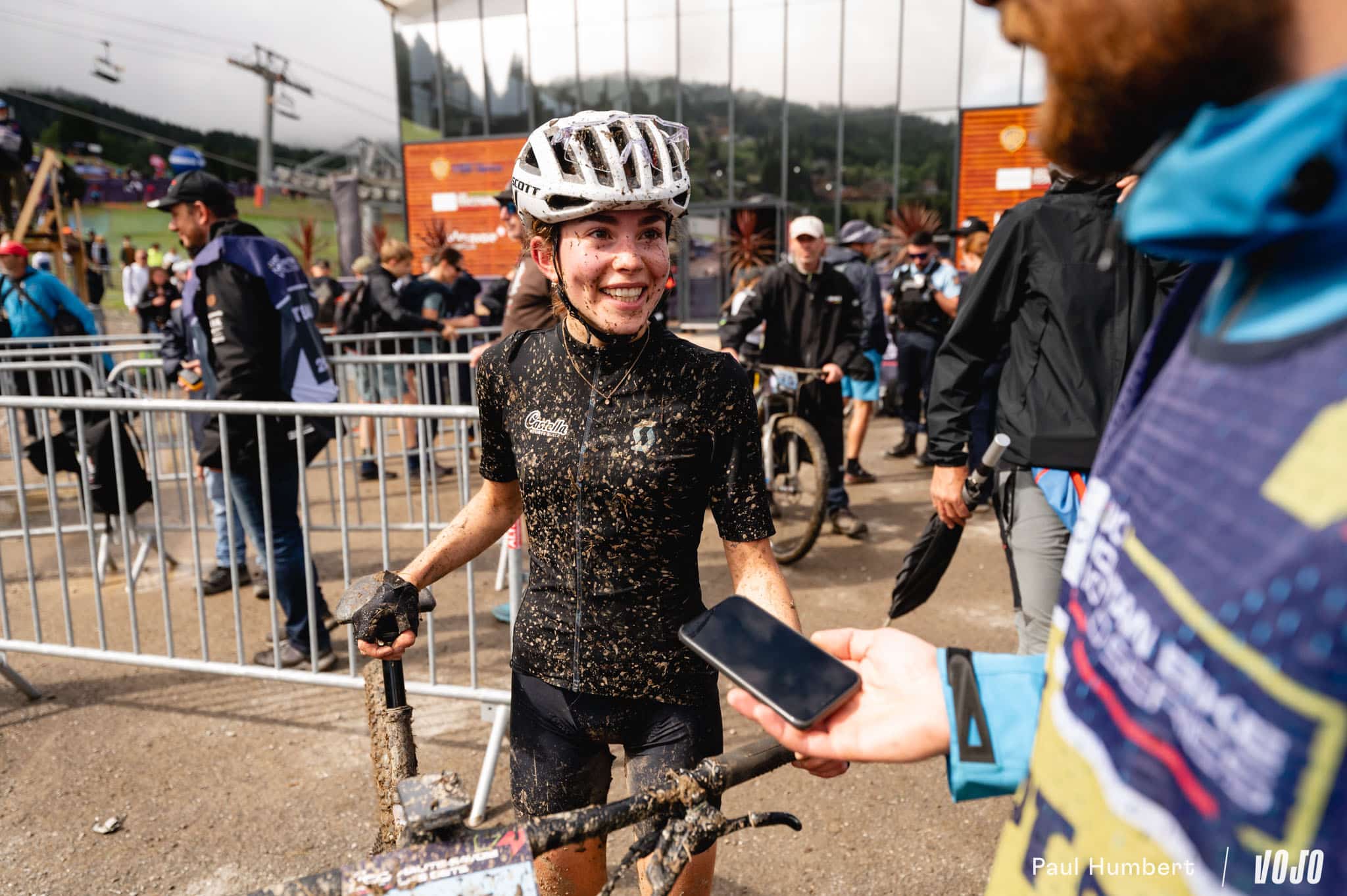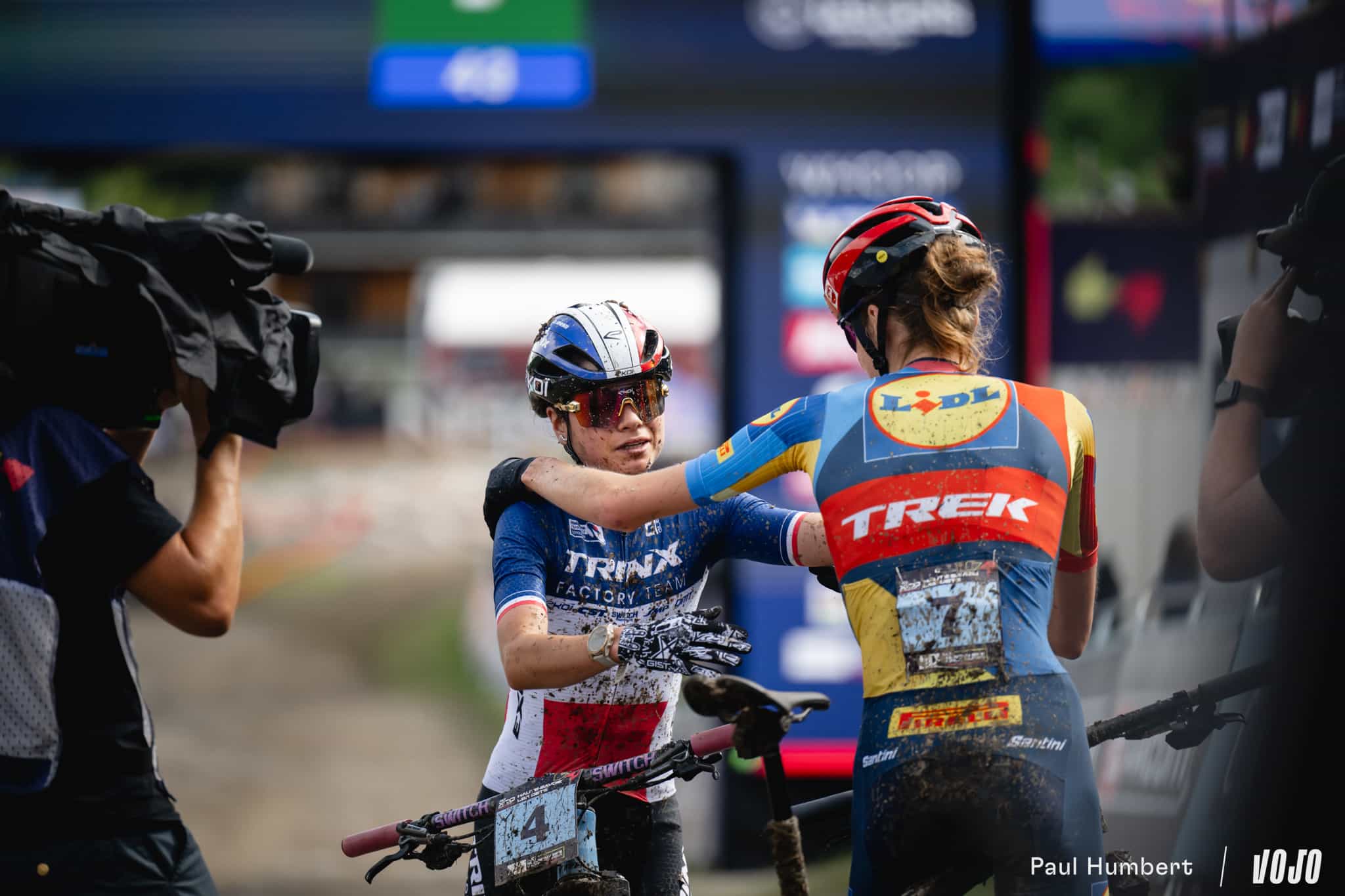 Après les cérémonies protocolaires, on parvient à retrouver Luca Martin pour qu’il revienne sur son exploit : « Course incroyable, comme je l’ai dit j’avais une côte pétée à Crans-Montana, je suis tombé malade, presque neuf jours sans vélo, vraiment sans rien faire avec de la fièvre et tout… Je suis arrivé là pas en forme au Short Track j’ai souffert, j’ai fait 14e, c’était horrible, j’ai cru que j’allais mourir sur le vélo, ce genre de jour. Et là… je sais pas, j’ai tenu Bjorn et je me suis dit « tu sais quoi, si je pète tant pis », j’ai roulé à bloc, dans les descentes je prenais des risques, je me suis régalé, les gens c’était incroyable. »