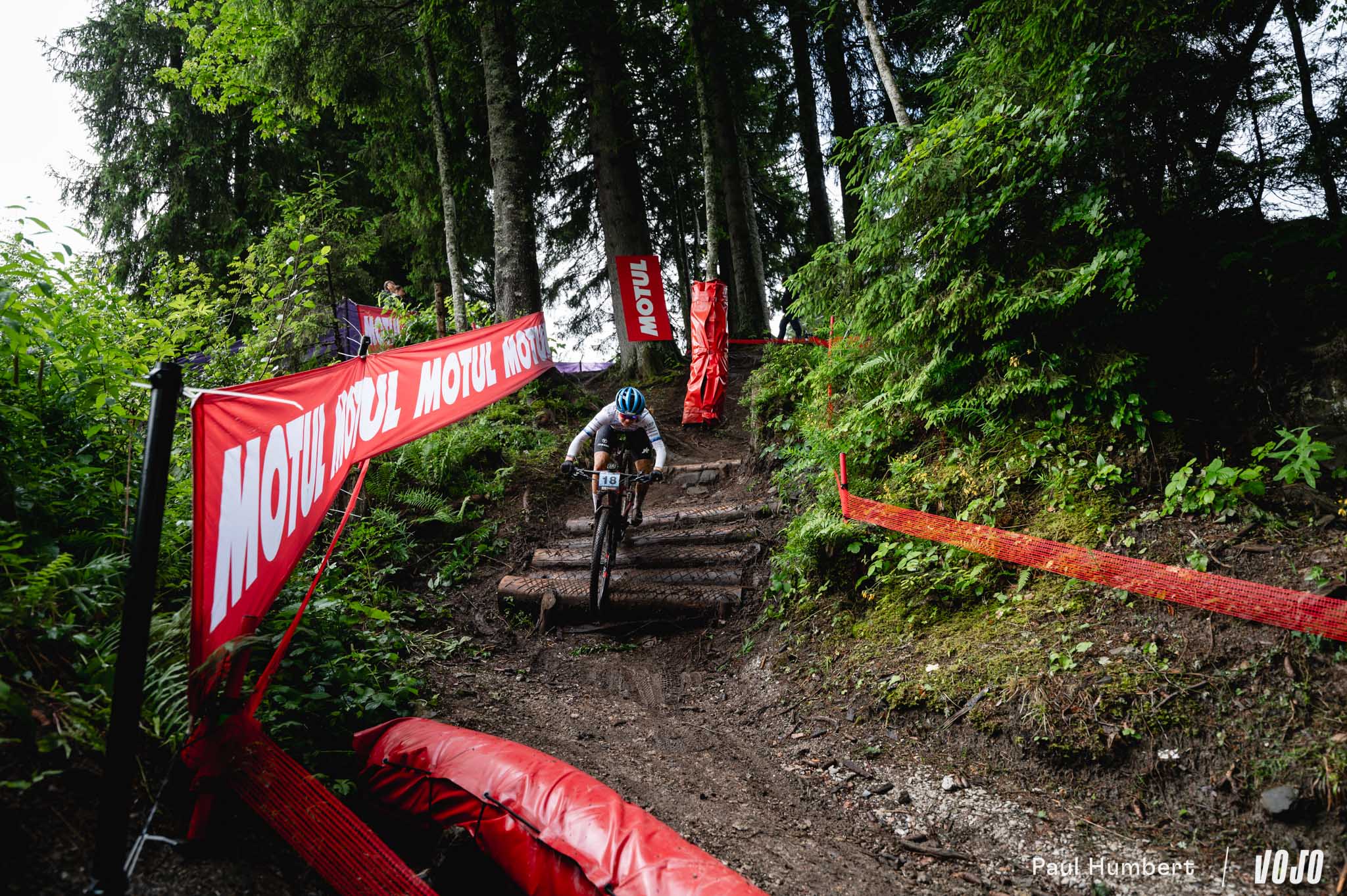 « Les Gets ça reste mythique, il y a des énergies de fou et c’est ça qui m’a poussé. Les conditions étaient piégeuses mais au final sur la bonne trace ça glissait pas trop. En fait j’ai découvert un nouveau circuit, j’ai pris des traces que j’avais jamais faites, je suis allé derrière des arbres… Je roulais à vue comme à la maison, en mode enduro parce que j’en fais pas mal et ça m’a bien servi aujourd’hui, ça m’a permis de gagner du temps dans les descentes. «