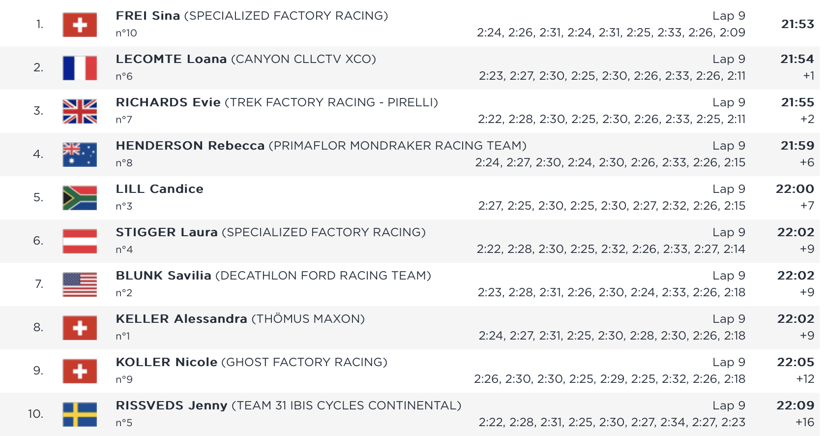 Rebecca Henderson et Candice Lill terminent au pied du podium, tandis que le top 10 est composé de Laura Stigger, Savilia Blunk, Alessandra Keller, Nicole Koller et Jenny Rissveds. On notera également la 24e place d’Emeline Detilleux, synonyme de troisième ligne pour le départ de dimanche.