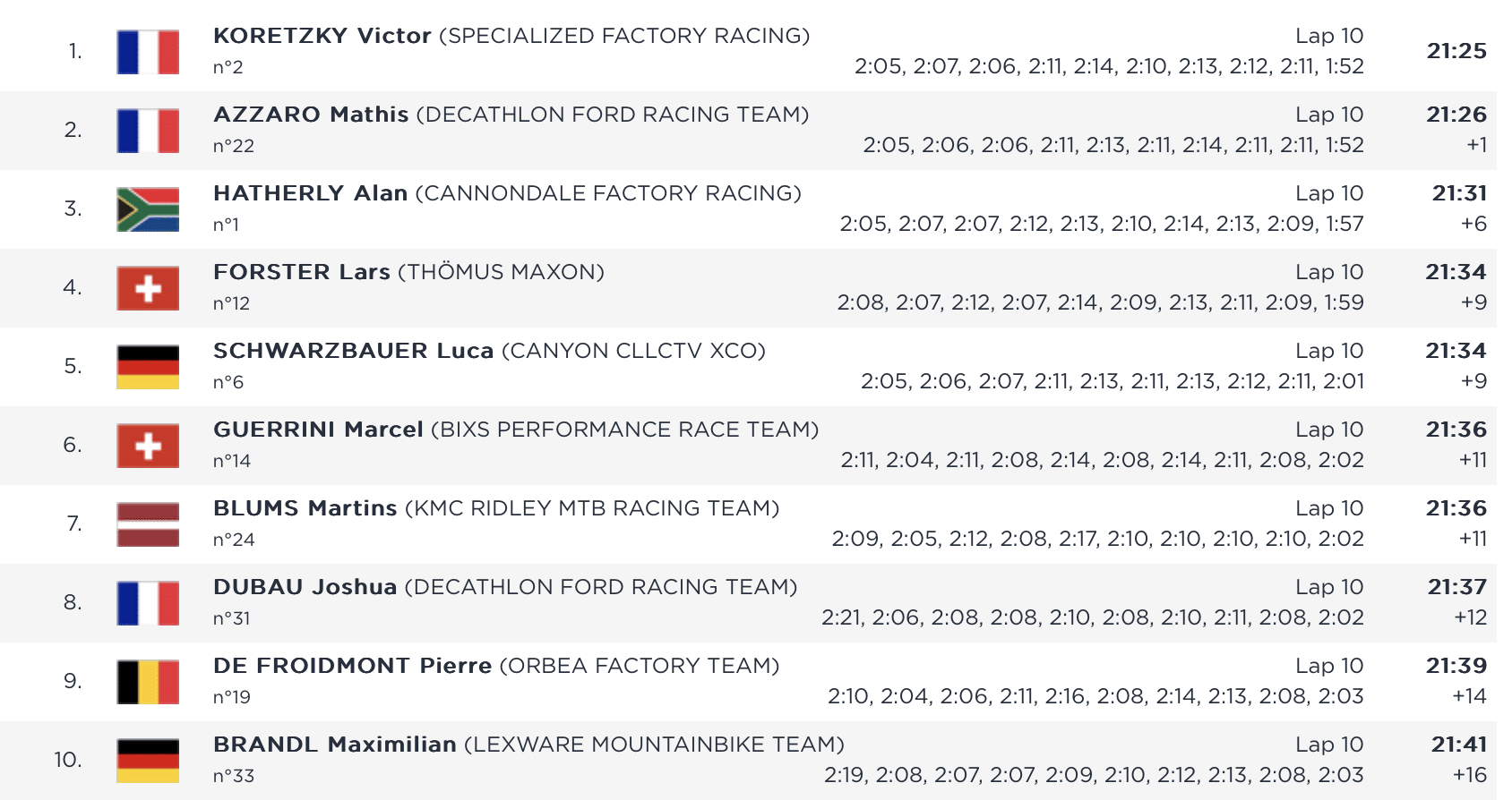 Le top 10 est complété par Lars Forster, Luca Schwarzbauer, Marcel Guerrini, Martins Blums, Joshua Dubau (auteur d’un gros retour en milieu de course), le Belge Pierre de Froidmont et Maximilian Brandl.