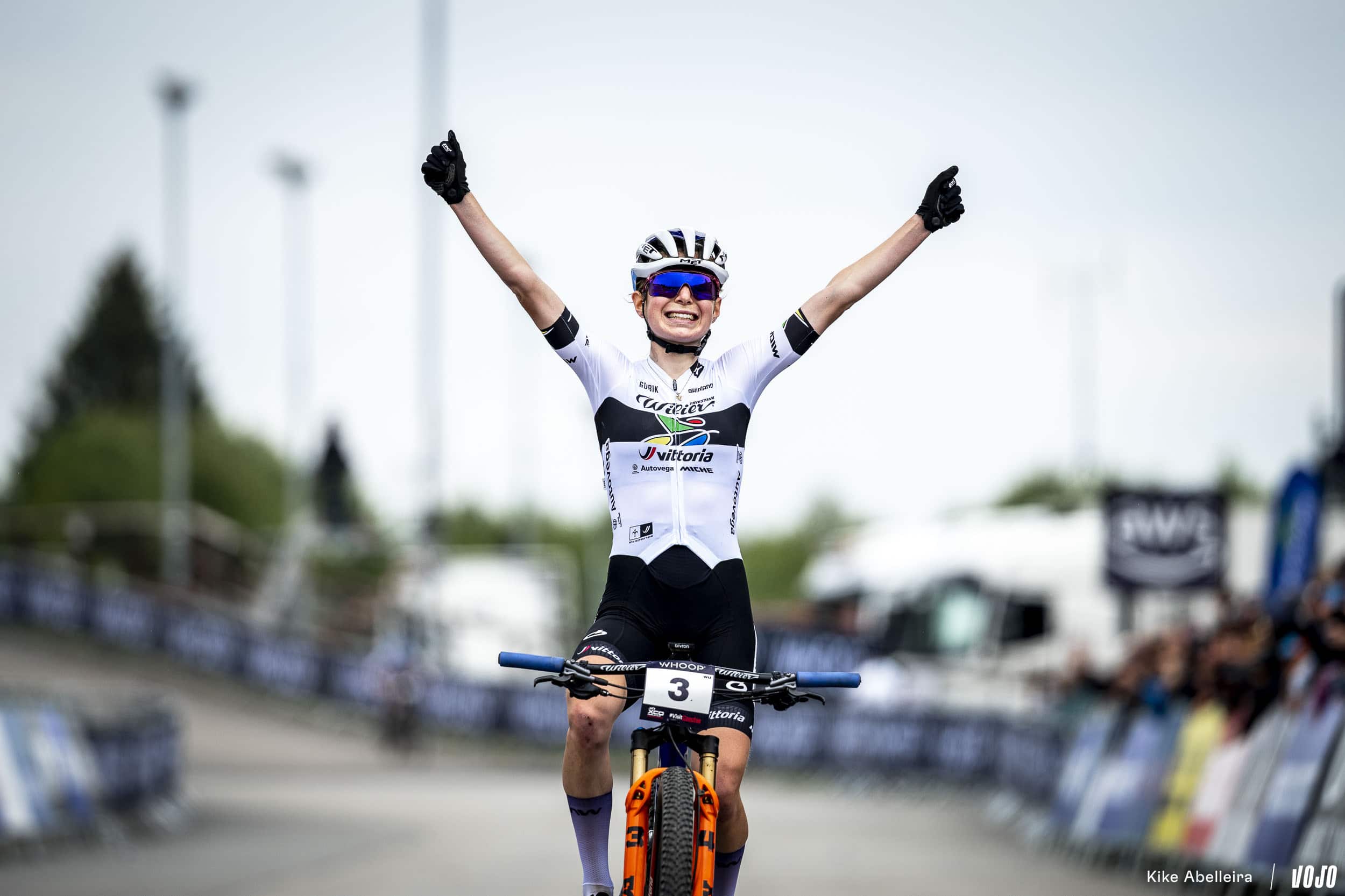 La réponse est Ella MacPhee, pilote du Wilier-Vittoria Factory Team, qui avait déjà montré de belles choses lors du XCC en terminant à la troisième place. Après une bataille face à Fiona Schibler pendant plusieurs tours, MacPhee parvient à prendre l’avantage et franchit la ligne d’arrivée en tête.