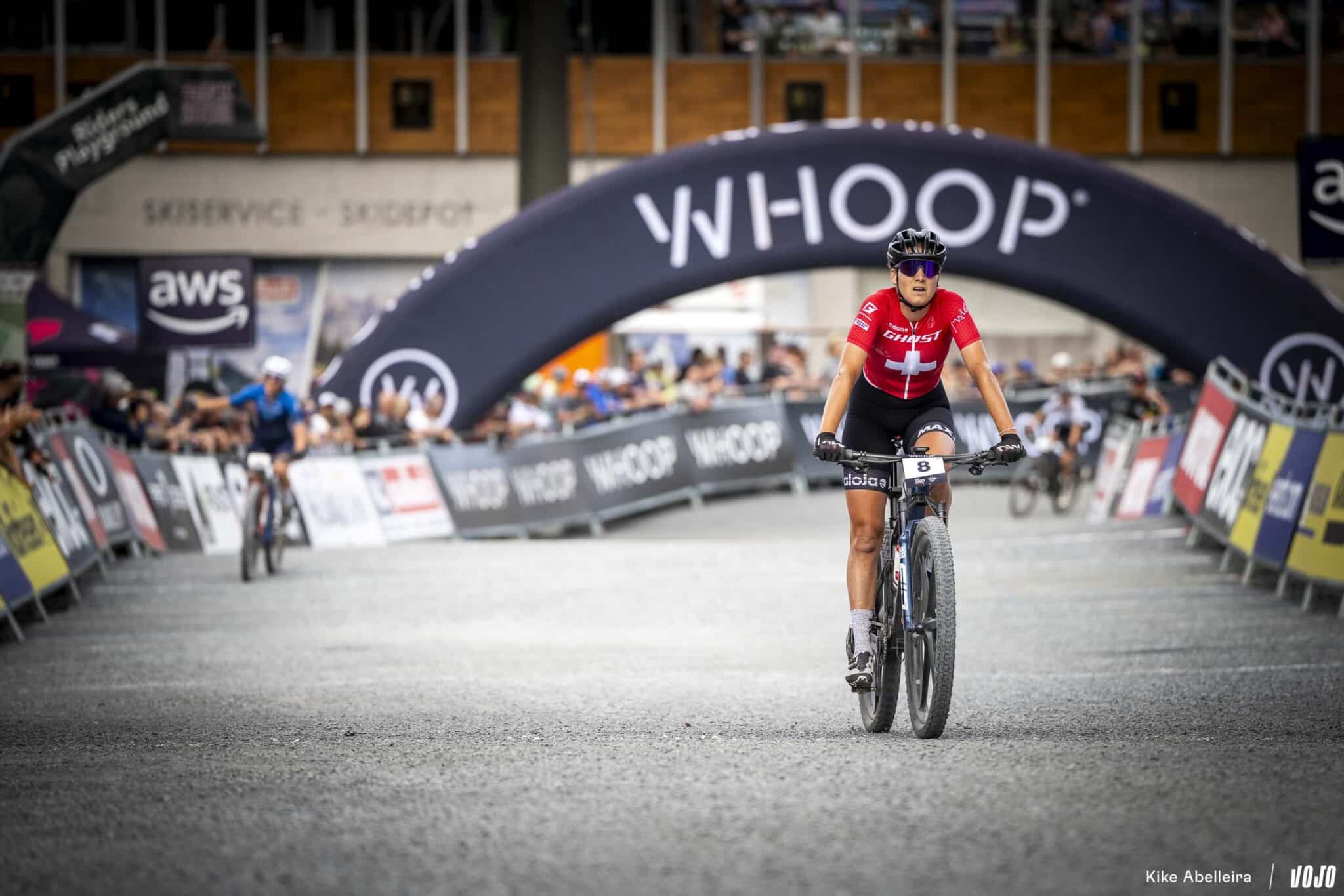 Mona Mitterwallner (dossard 59) a aussi montré sa très bonne forme : habituellement très discrète sur les Short Track, la championne du monde en titre du format marathon et gagnante de la dernière course XCO à Nove Mesto, va ici cueillir une très belle 4e place devant Candice Lill (dossard 12, à droite).
