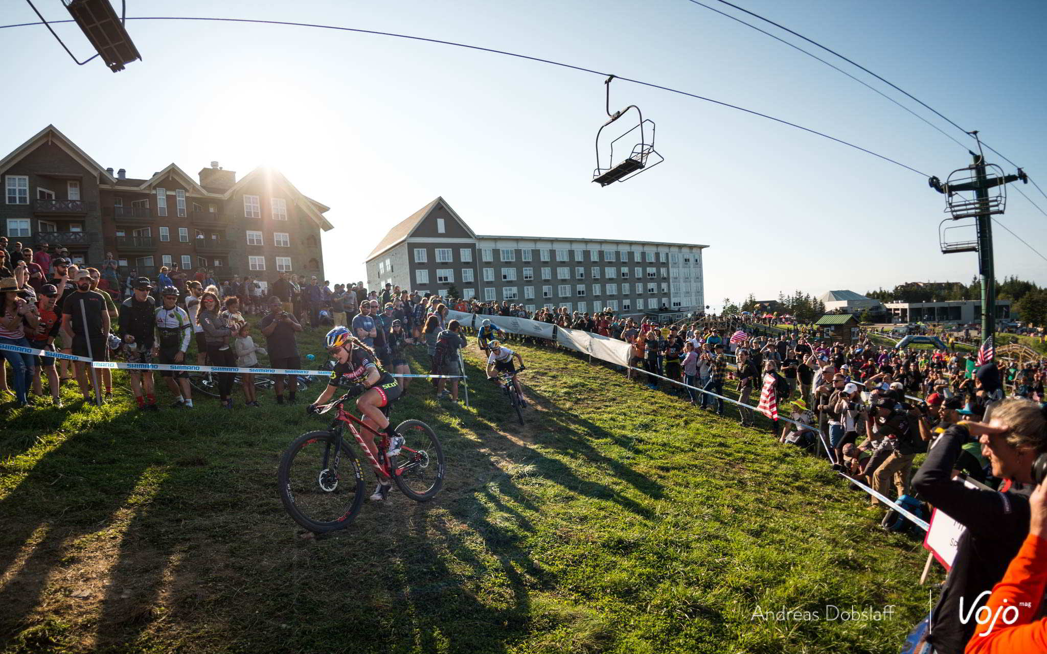 Au départ de ce Short Track, à Snowshoe, les enjeux sont conséquents. Outre le placement au départ de la course de dimanche, cette épreuve courte et intense distribue des points au classement général. En l’occurrence, Jolanda Neff et Kate Courtney ont toutes les deux la victoire générale de la coupe du monde 2019 dans le viseur. Chaque point compte ! Neff, sur son Trek, prend un départ très rapide. La pilote suisse entend bien montrer qu’elle fera tout pour remporter le général de la coupe du monde de XC 2019.