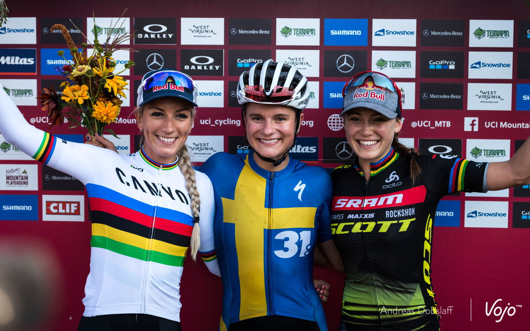 Kate Courtney et Pauline Ferrand-Prévot (PFP) suivent. La pilote américaine a perdu son maillot arc-en-ciel il y a quelques jours au Canada, au profit de la Française !