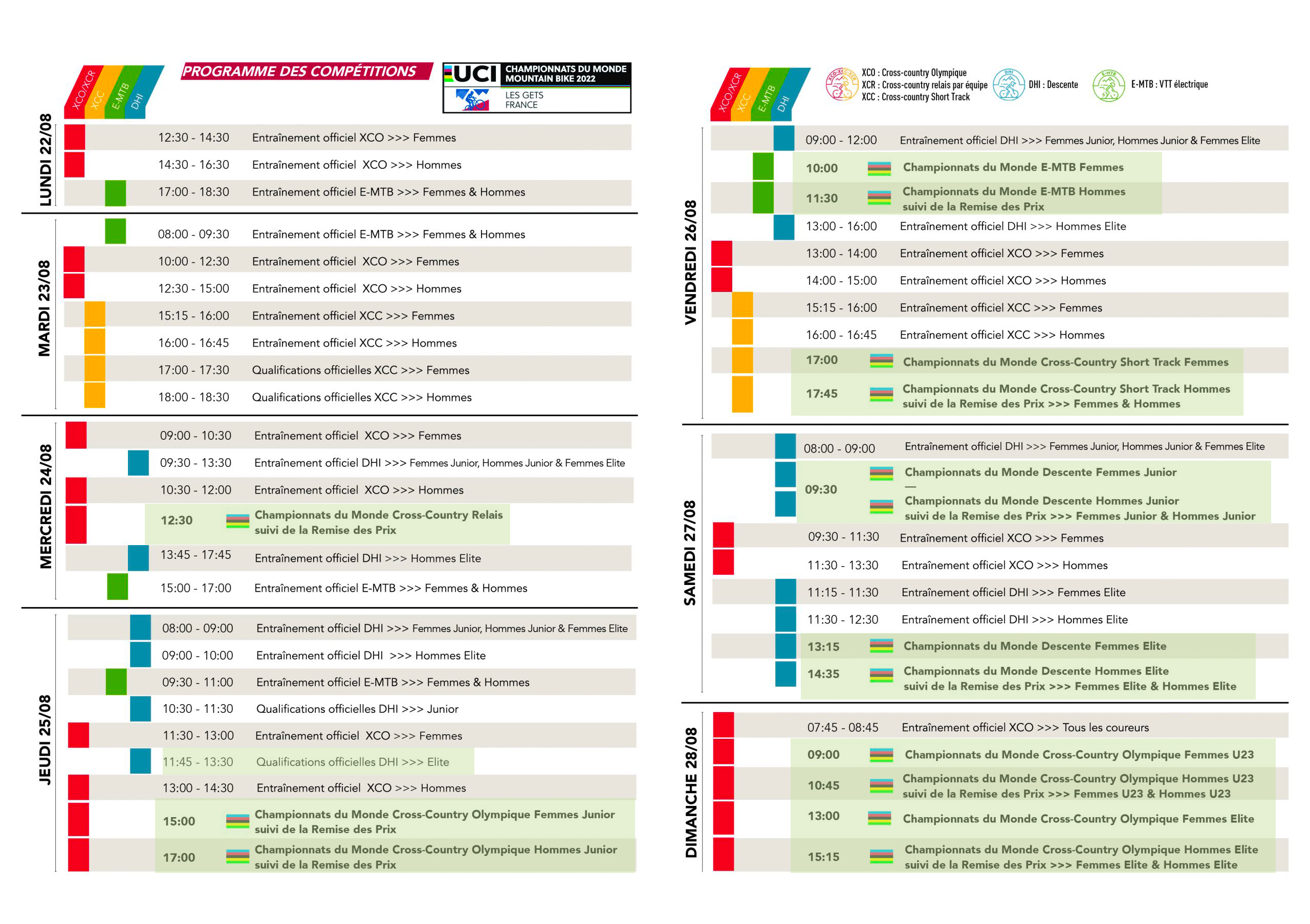 - Samedi 27/08 : Samedi rime avec DH. Les finales junior débuteront à 9h30, les femmes élites sont programmées à 13h15, et la journée se finira sur les hommes élites à 14h35.
