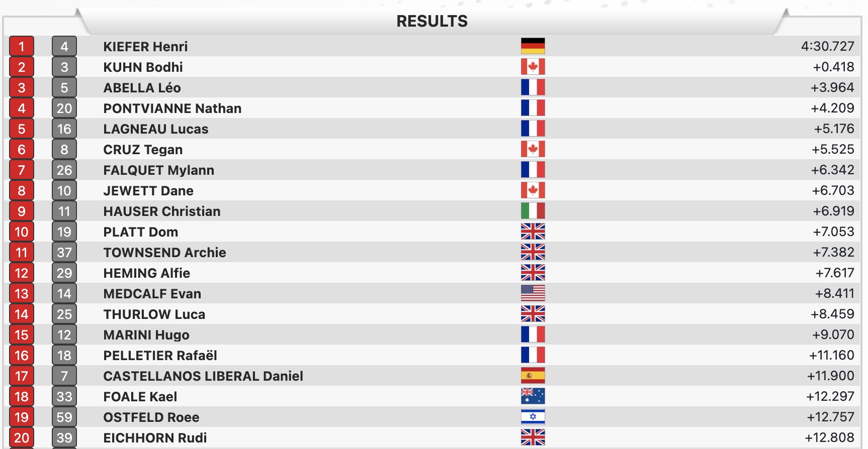 Le podium était encore 100% français à quelques minutes de la fin de ces finales Juniors. Mais il restait deux solides candidats à la victoire au départ, et ils ont tenu leur rang. Avant-dernier à s’élancer, l’Allemand Henri Kiefer a douché les espoirs des Français en améliorant largement la marque, de pratiquement 4 secondes. Et ce nouveau chrono de référence va tenir jusqu’au bout, malgré le très bon run de Bodhi Kuhn qui échoue finalement à moins d’une demie-seconde.