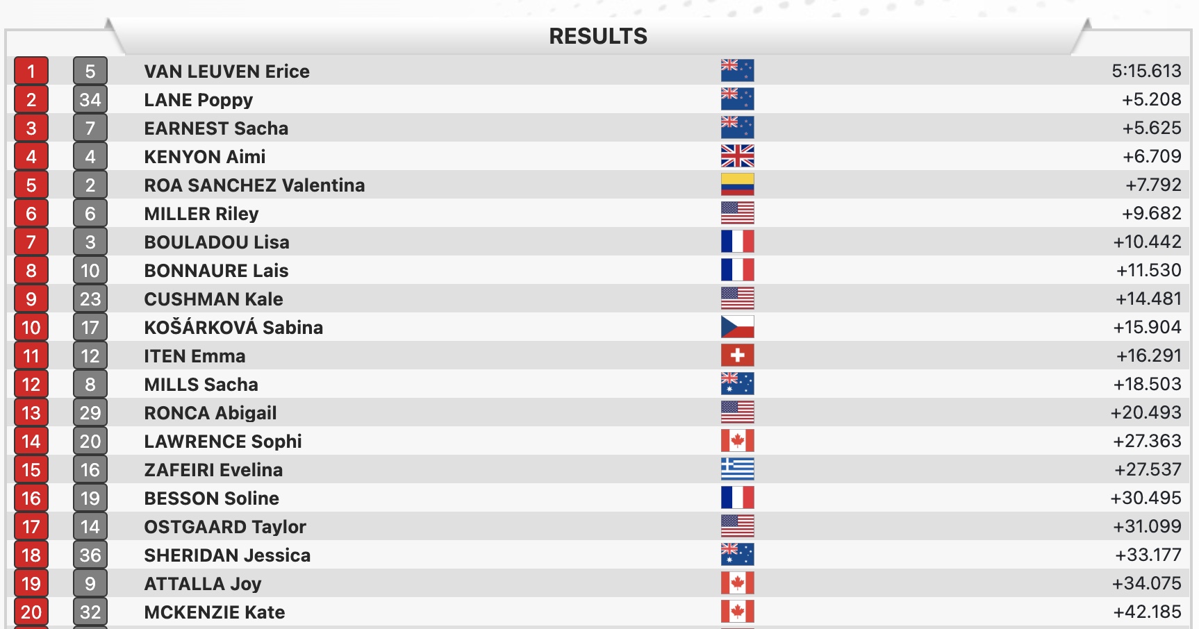 Longtemps dans le hot seat, Poppy Lane décroche l’argent alors que Sacha Earnest repart avec la médaille de bronze. Le top 5 est complété par Ami Kenyon et Valentina Roa Sanchez.