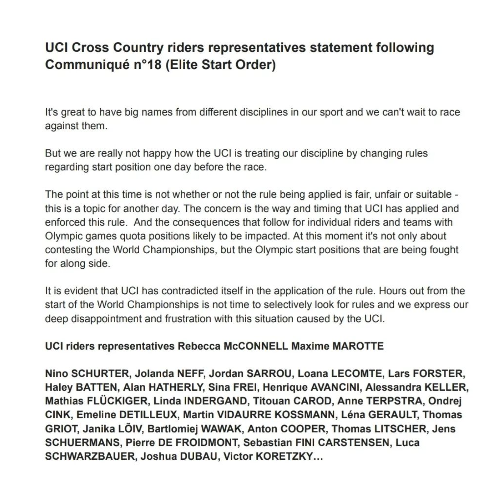 « Les teams XC Elite rencontrés la nuit dernière sont choqués par cette décision, qui ne nous montre pas seulement que des décisions autocratiques semblent être prises au cas par cas dans un événement qualificatif pour les Jeux Olympiques, avec peu de respect pour les athlètes pour qui cette discipline est un travail à temps plein, à la faveur de coureurs sur route qui cherchent à décrocher une qualification olympique dont ils ne sont pas assurés dans leur discipline première. Le VTT XC ne peut pas être vu comme un « back up plan » pour des places olympiques pour des athlètes venus de la route. »