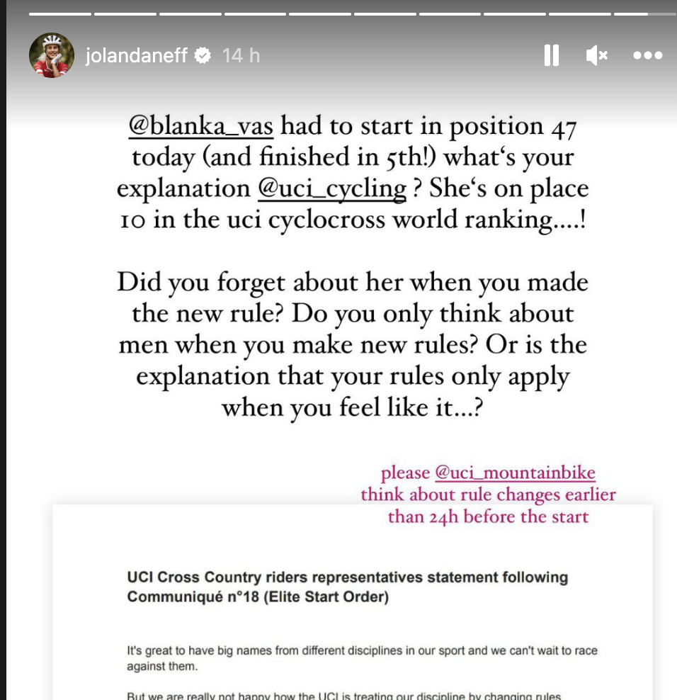 Jolanda Neff a également pointé le fait que cette règle est vraiment taillée sur mesure pour quelques pilotes de la course masculine, en remarquant que Blanka Vas, 10e au classement mondial de cyclocross, était partie en dernière ligne de la course U23 disputée ce vendredi, ce qui ne l’avait pas empêchée de terminer 5e. « L’UCI ne pense-t-elle qu’aux hommes Elite en établissant ses règles ? »